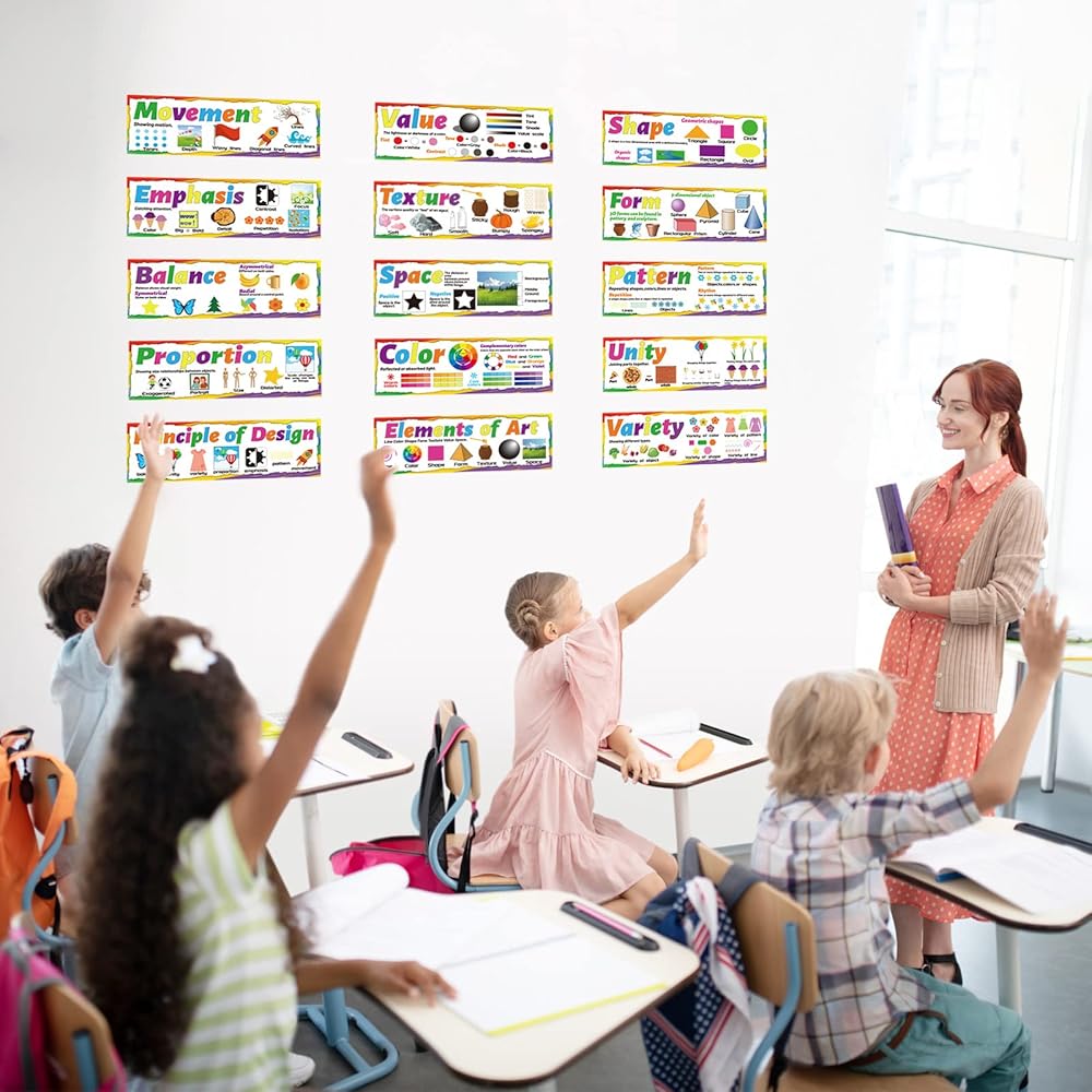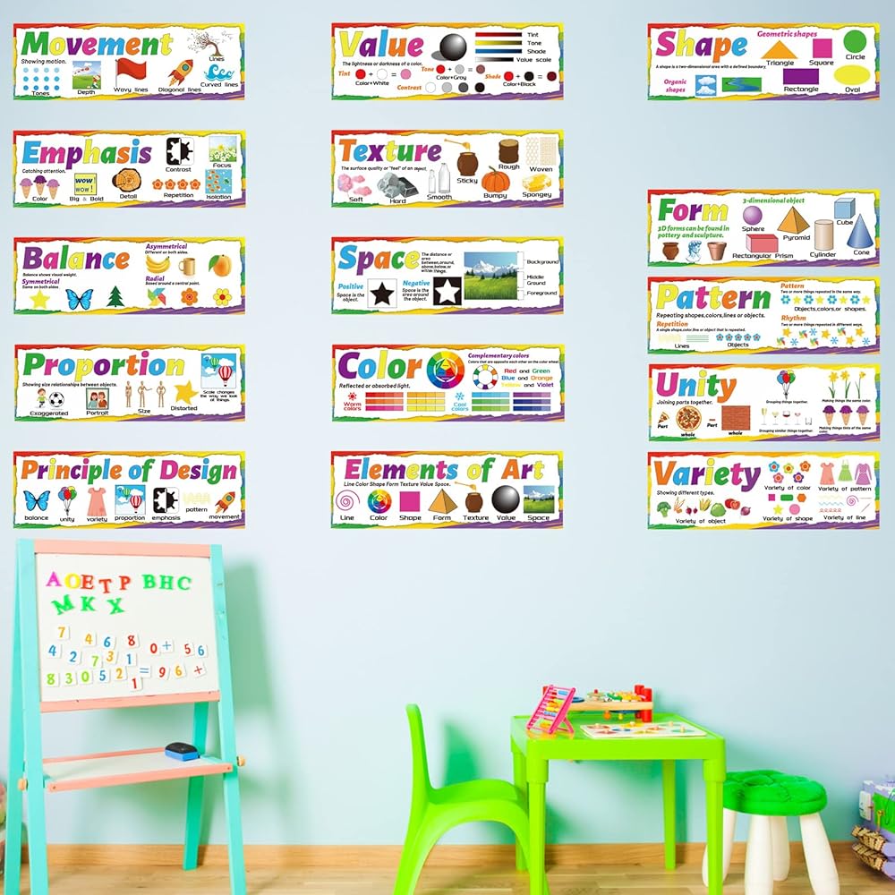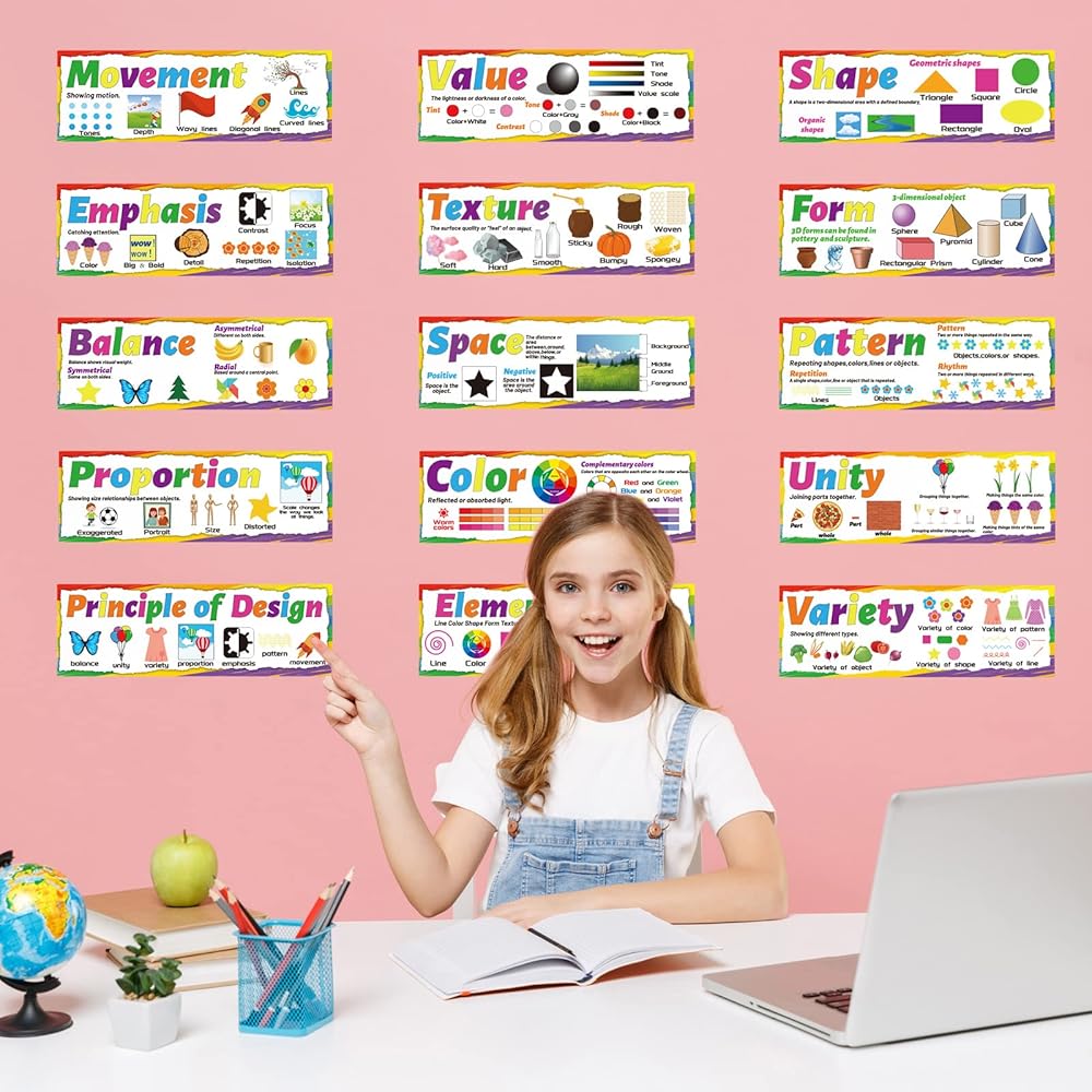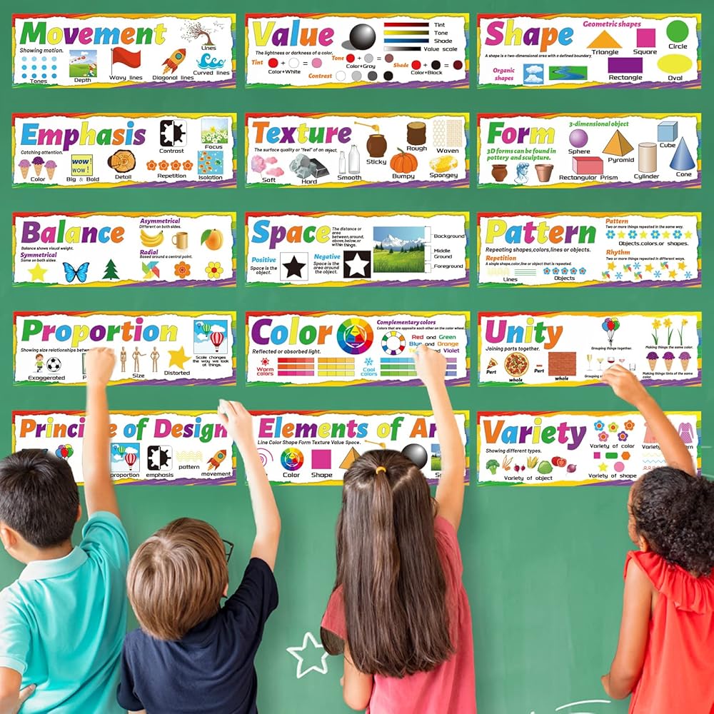 مجموعة ملصقات فنية من عناصر الفن لمبادئ التصميم، مجموعة لوحة اعلانات فنية للفصول الدراسية، ملصقات تعليمية فنية لتزيين المدرسة الإعدادية والثانوية والفصول الدراسية