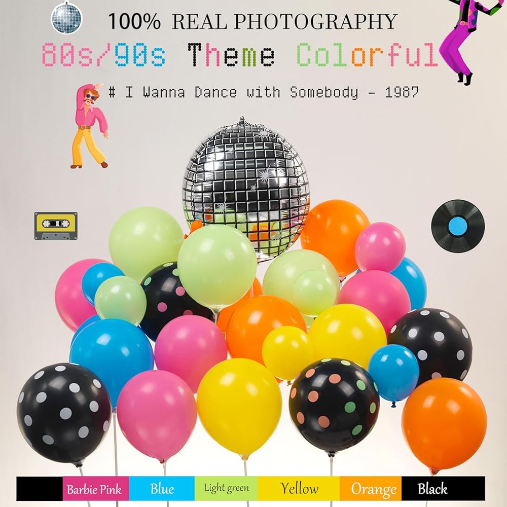 【مجموعة بالونات تحمل طابع التسعينيات 】إجمالي نجاحات الثمانينيات والتسعينيات مع هذه البالونات الملونة النابضة بالحياة، بما في ذلك 150 قطعة من بالونات اللاتكس ومايلار التالية بأحجام مختلفة، اخترنا اللون البرتقالي والأزرق والأخضر كلوحة أساسية للموضوع، أضف 10 قطع من نقاط البولكا باللون الأسود. بالونات وبالونات إضافية ذات طابع Myalr مع عنصر Musci من الثمانينيات والتسعينيات، مثل مسجل الشريط/التزلج على الجليد/كرة الديسكو... تعال مع تلك الذاكرة التي تنتمي إلى عصر الموسيقى العظيم، اصنع جوًا مبهجًا وعتيقًا، مرحبًا بك، يا صديقي، فقط تفقد نفسك للرقص!