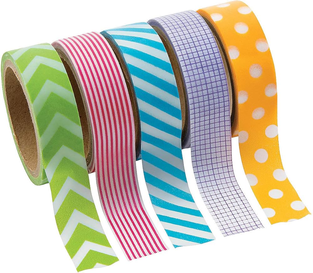 Primary Patterned Washi Tape Set. You'll find dozens of uses for this decorative tape! From handmade cards and party invitations and scrapbook pages to framed art, this colorful craft tape is a must-have for your craft supplies! Each roll includes 16 ft. of tape. (5 rolls per unit) 5/8
