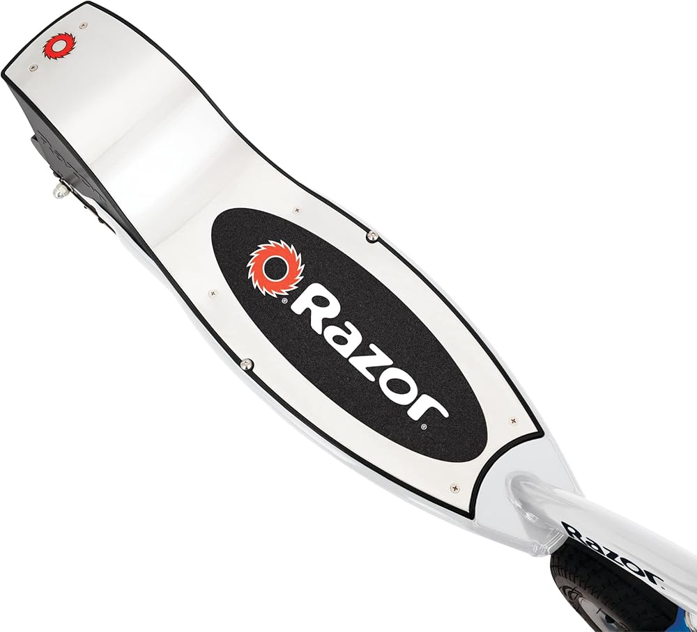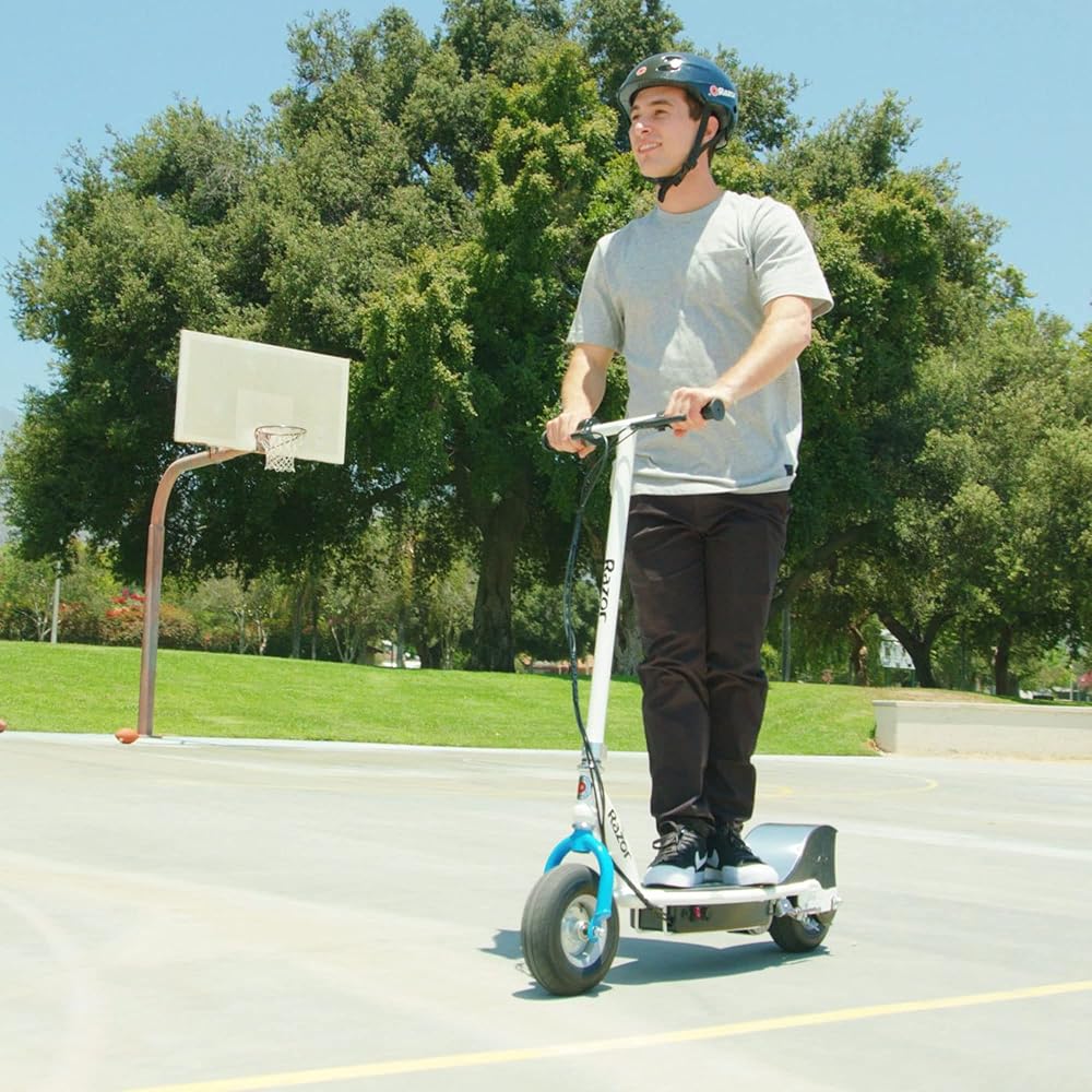 رازور سكوتر كهربائي E300 - اطارات مملوءة بالهواء مقاس 9 انش، حتى 15 ميل في الساعة ونطاق 10 اميال، ابيض/ازرق
