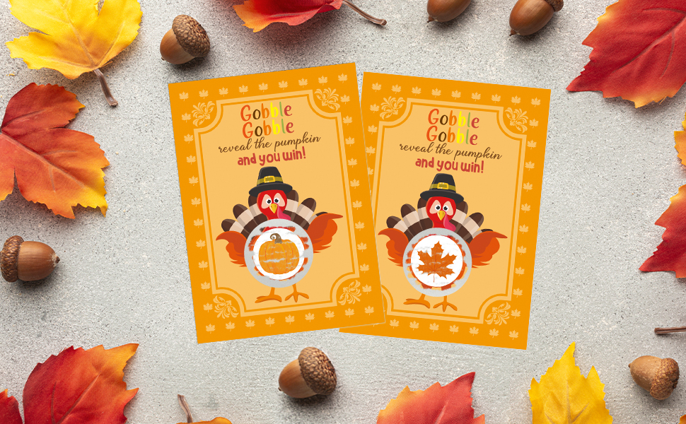 🚀 سهل الاستخدام. ما عليك سوى وضع ملصقات الخدش على الدائرة الصغيرة لبطاقات الديك الرومي. يمكنك بسهولة تحديد عدد الفائزين مسبقًا. اخدش واكشف عن "اليقطينة للفوز" أو "ورقة القيقب للخسارة".