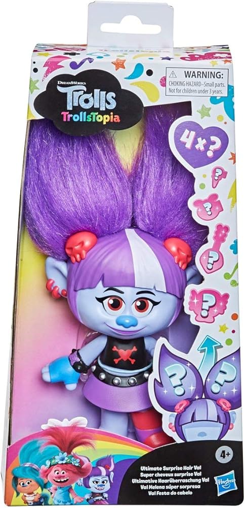 تدور أحداث دريم ووركس ترولز حول الشعر، ولديها دمية التيميت سربرايز هير فال مفاجآت كبيرة تنتظر الأطفال في شعرها! هناك جيبان سريان مخفيان هناك، واحدة في كل ضفيرة من ضفائرها، وعندما يضغط الأطفال على واحدة، فإنها تكشف عن مخلوق مخفي بالداخل. اضغط على المخلوق، وهناك مفاجأة أخرى بالداخل، والتي يمكن استخدامها كمشبك شعر. عندما يضغطون على الضفيرة الأخرى، هناك مخلوق مختلف بالداخل، فرشاة شعر مخملية على شكل جيتار. إنها مفاجآت داخل المفاجآت داخل المفاجآت! وبعد اللعب معهم، يمكنهم إعادتهم جميعًا مرة أخرى. سيحب الأطفال اكتشاف ما هو مخفي داخل شعر فال وهم يتخيلون مغامرات موسيقية مع هذه الشخصية المفضلة.