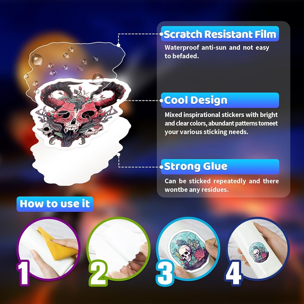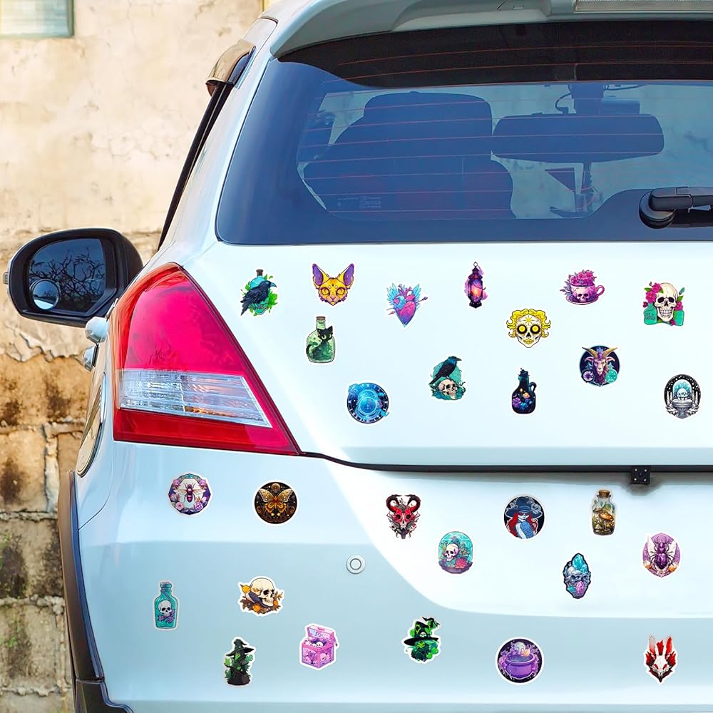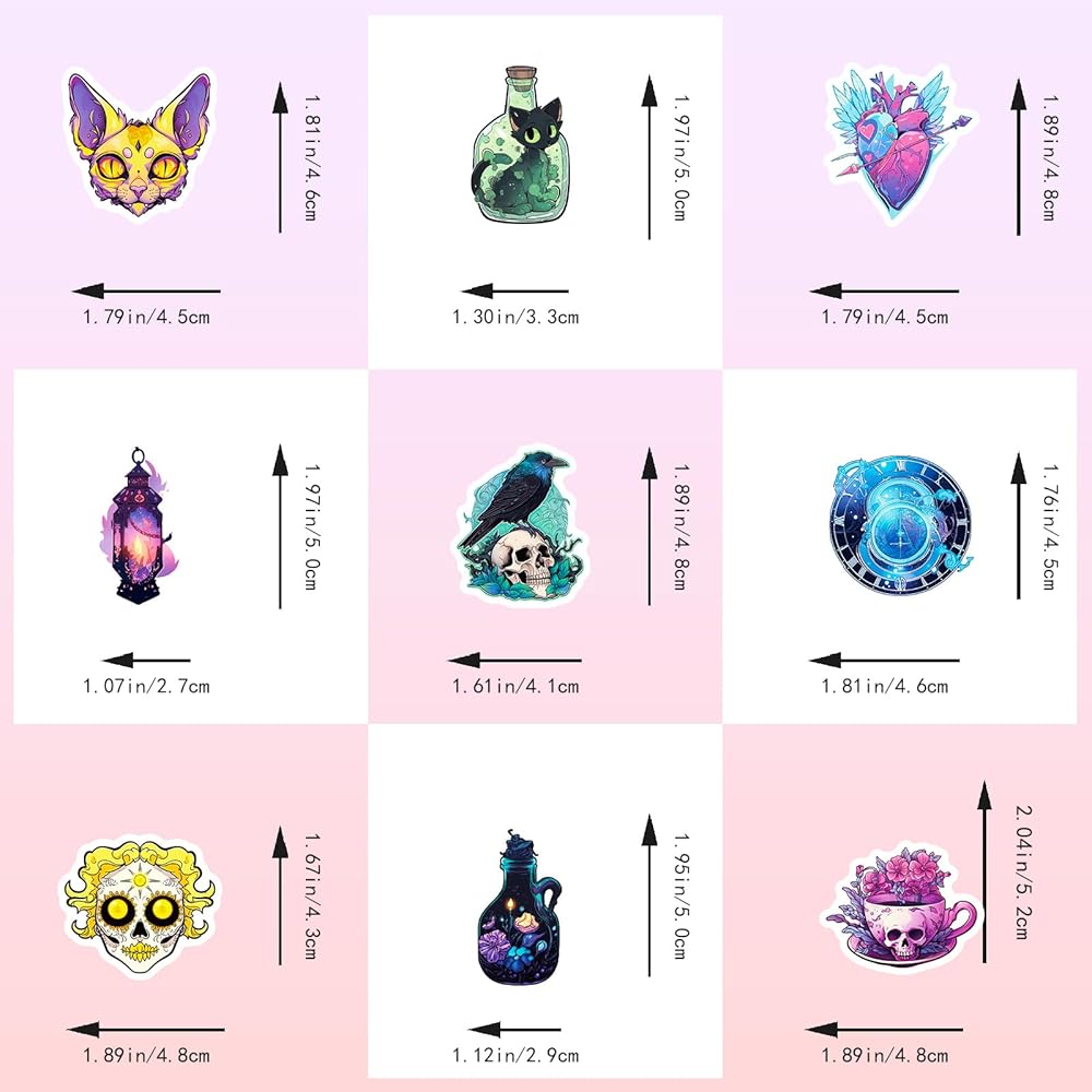 • 2️⃣ Versatility and Size Compatibility: With dimensions ranging from 2.1 to 2.56 inches, these stickers are suitable for various surfaces, such as skateboards, car bumpers, suitcases, water bottles, and home decor. Apply them to your favorite items to add unique personality and eerie vibes.
