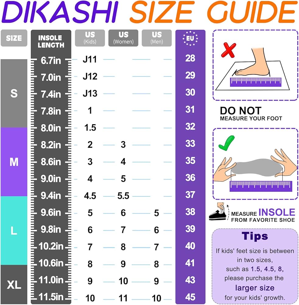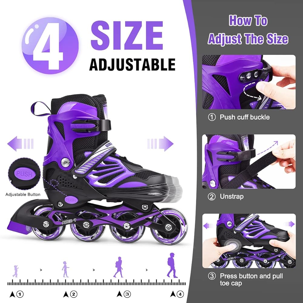 زلاجات مضمنة قابلة للتعديل: زلاجات دوارة مضمنة لها 4 مقاسات مختلفة، S/M/L/XL. وكل مقاس قابل للتعديل، بزر واحد فقط، يمكنك ضبط المقاس بسهولة. المقاس المتوسط (2-4.5) يناسب مقاسات الأطفال 2-4.5، مقاسات النساء 3-5.5. المقاس المتوسط يناسب عمر طفلك بين 8- 10 سنوات. يرجى التأكد من اختيار المقاس الصحيح من خلال التحقق من صور جدول المقاسات المرفقة. نصيحة: إذا كان مقاسك هو مقاس الأطفال 4.5، فيرجى اختيار مقاس كبير (5-7.5) لنمو أطفالك.