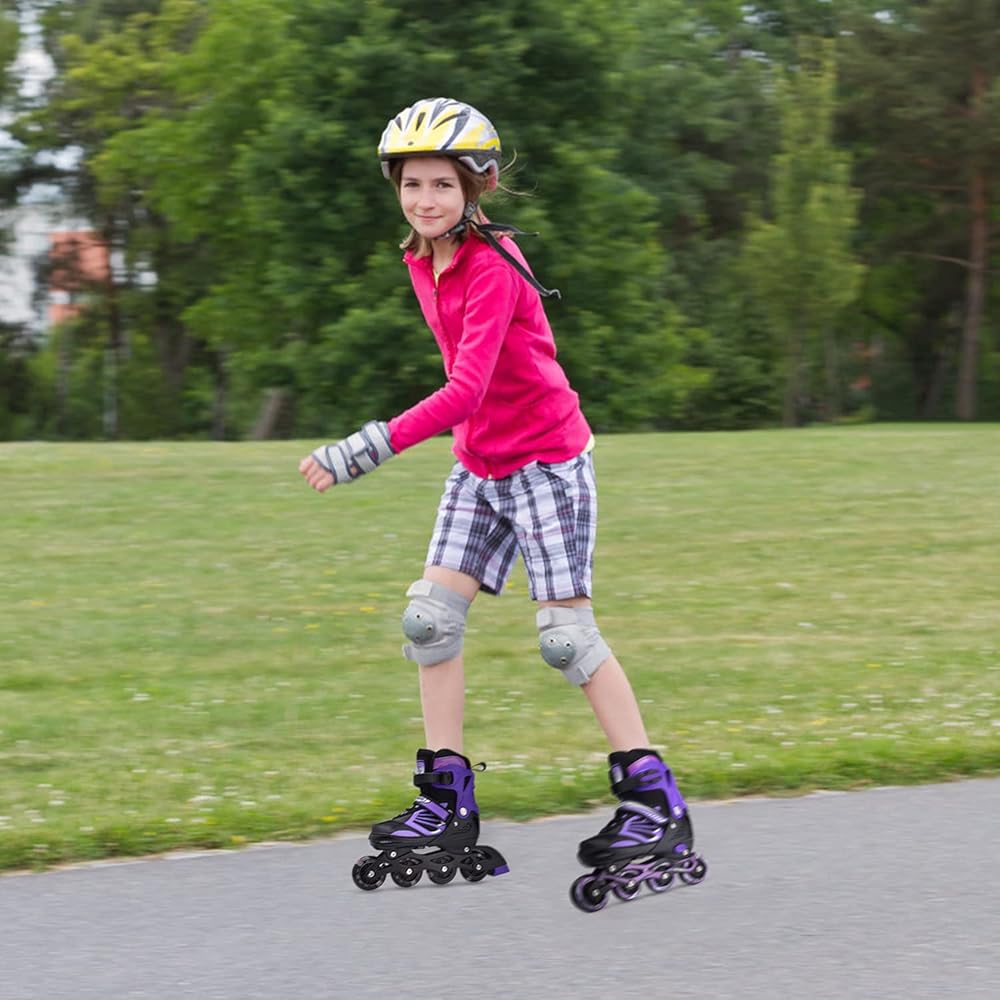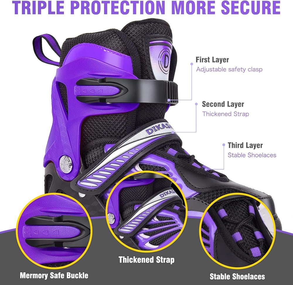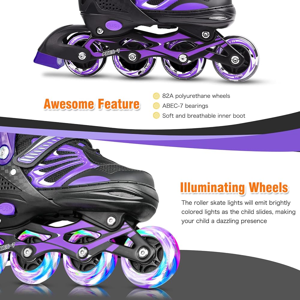 مادة مريحة ومتينة: إطار من الألومنيوم المقاوم للصدأ، أربطة أحذية مقاومة للاهتراء، جزء علوي مسامي على شكل قرص العسل، طوق وأشرطة متينة، عجلات من البولي يوريثين 82A ومحامل ABEC-7 عالية الأداء توفر انزلاقات سلسة وهادئة وآمنة. وتتميز زلاجات الأطفال المضمنة بنظام حماية ثلاثي، كما أنها رائعة للمبتدئين. فقط استمتع برحلة سلسة وهادئة وواثقة.