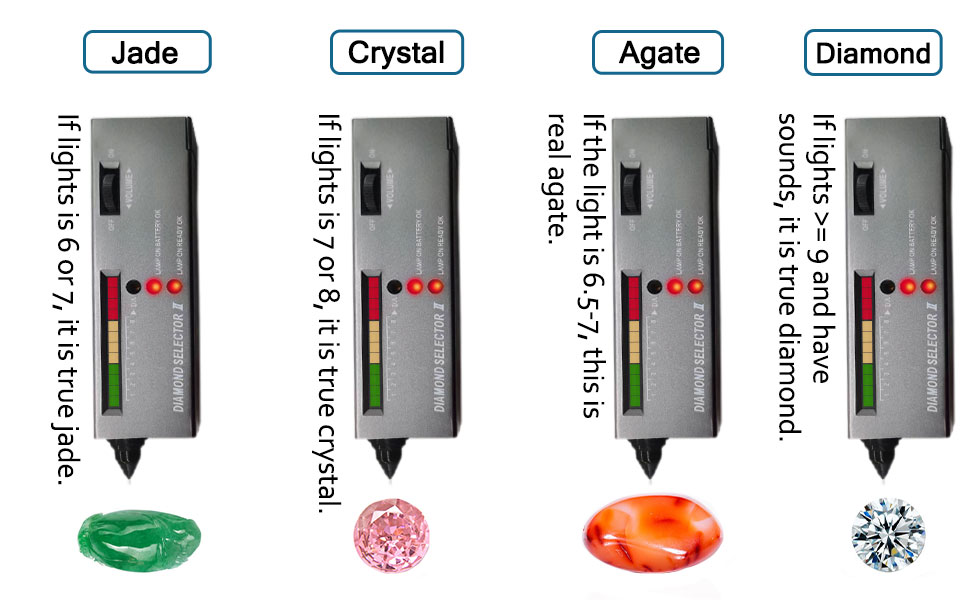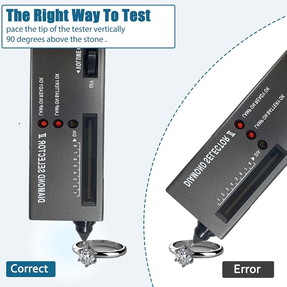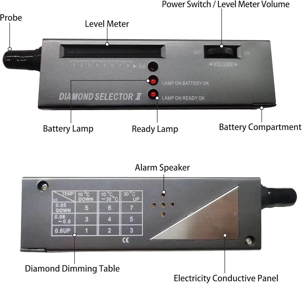 سهلة الاستخدام: تم تجهيز أجهزة الكشف الخاصة بنا بضوء LED ومؤشر صوتي لراحة المستخدم. ما عليك سوى تشغيل الأداة ووضع طرف جهاز الاختبار مباشرة فوق الحجر بزاوية 90 درجة. إذا كان الحجر ماسة أصلية، فإن الأداة ستصدر صوتًا عند الانتهاء من الاختبار. في حالة وجود حجر مزيف، لن يكون هناك صوت صفير.