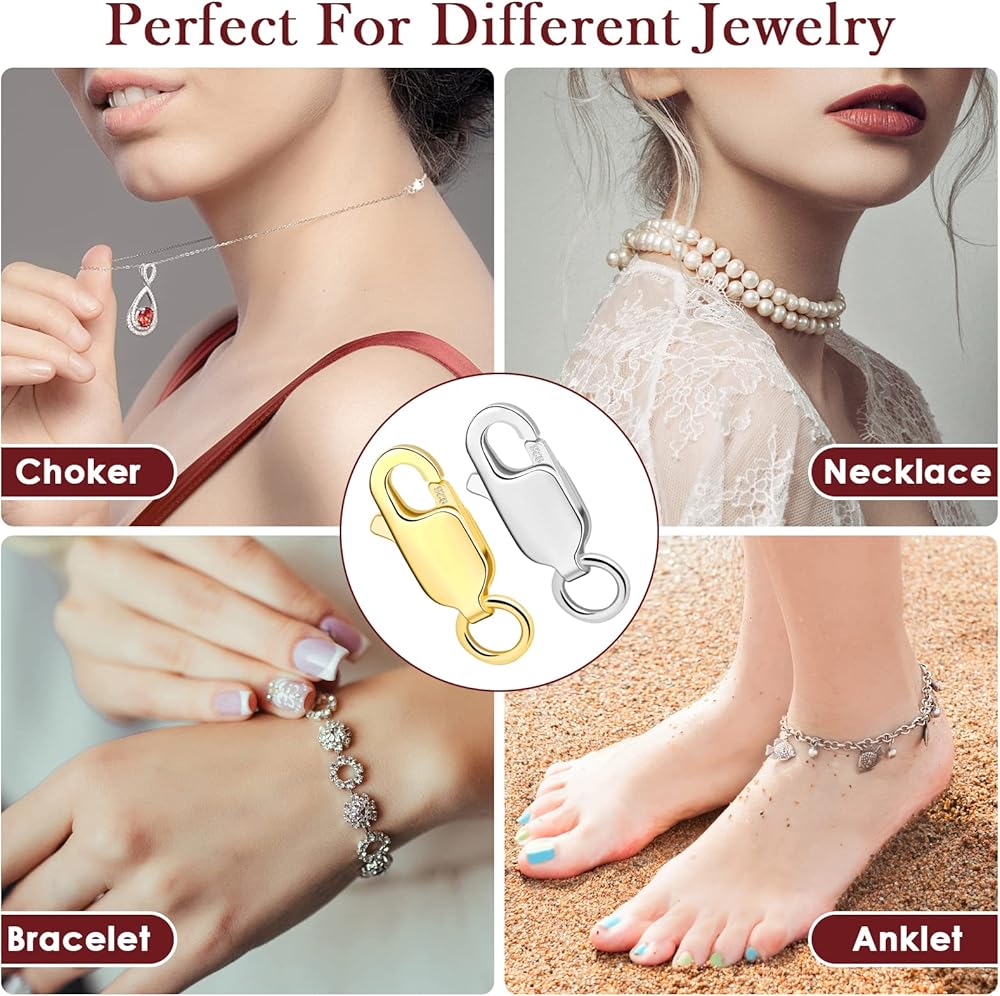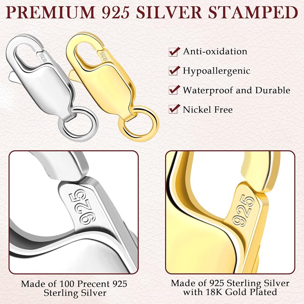 【فضة استرلينية ولا تسبب الحساسية】 فضة ستيرلينج 925 صلبة بنسبة 100%، مختومة 925، وطلاء ذهبي عيار 18 قيراط. الفضة الإسترلينية لا تسبب الحساسية وخالية من النيكل، مما يجعلها خيارًا ممتازًا للأشخاص الذين يعانون من تهيج الجلد. كل مشبك قلادة من الفضة الإسترلينية مطلي بطبقة واقية شفافة للمساعدة في منع فقدان البريق، مما يجعل لون مجوهرات الفضة الاسترلينية أكثر امتلاءً ويدوم لفترة أطول، ومقاومة للتآكل. حواف ناعمة مستديرة لن تخدش البشرة الحساسة وتلمس بشكل مريح