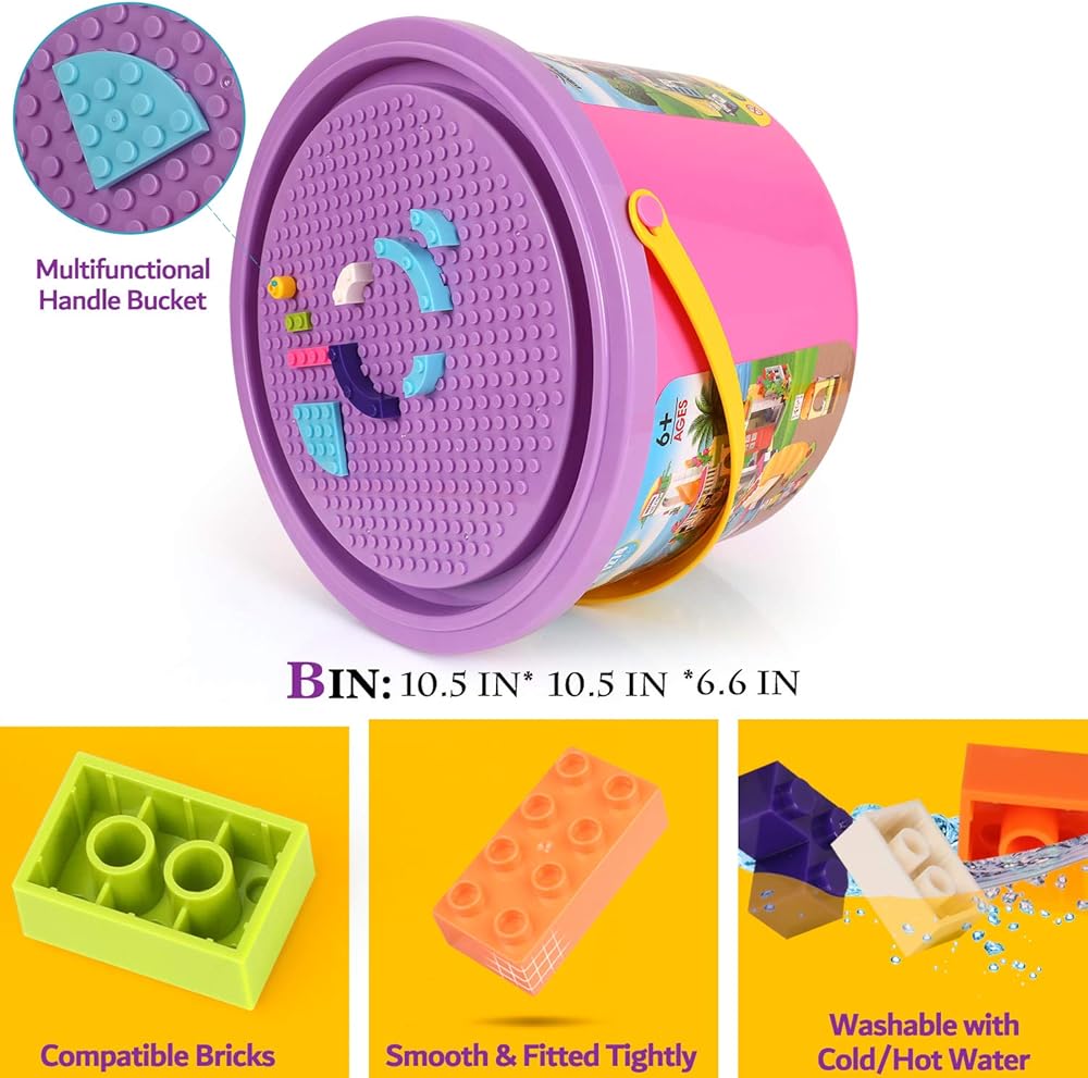 إجمالي 1274 قطعة من مكعبات بناء بيت الشجرة وحمام السباحة في دلو تخزين، سهلة الحمل والجمع والتنظيف. تتميز بـ 4 سيارات رياضية وزحليقة وحديقة وحامل طعام وما إلى ذلك.