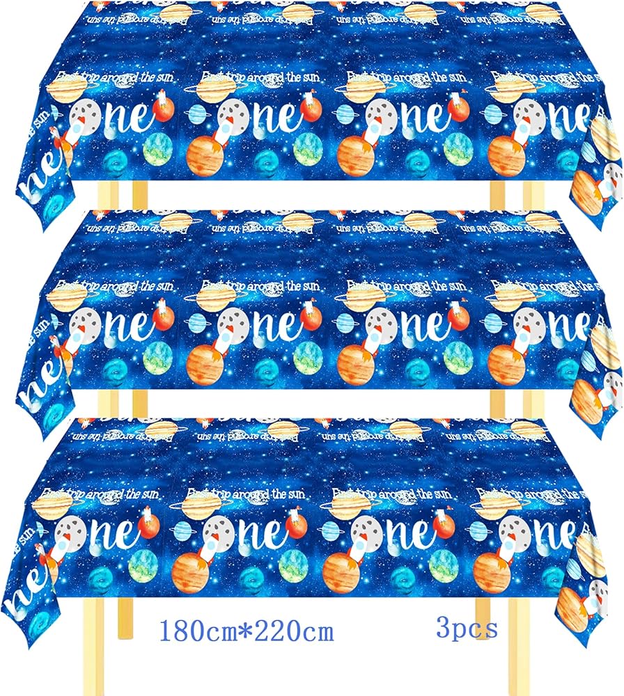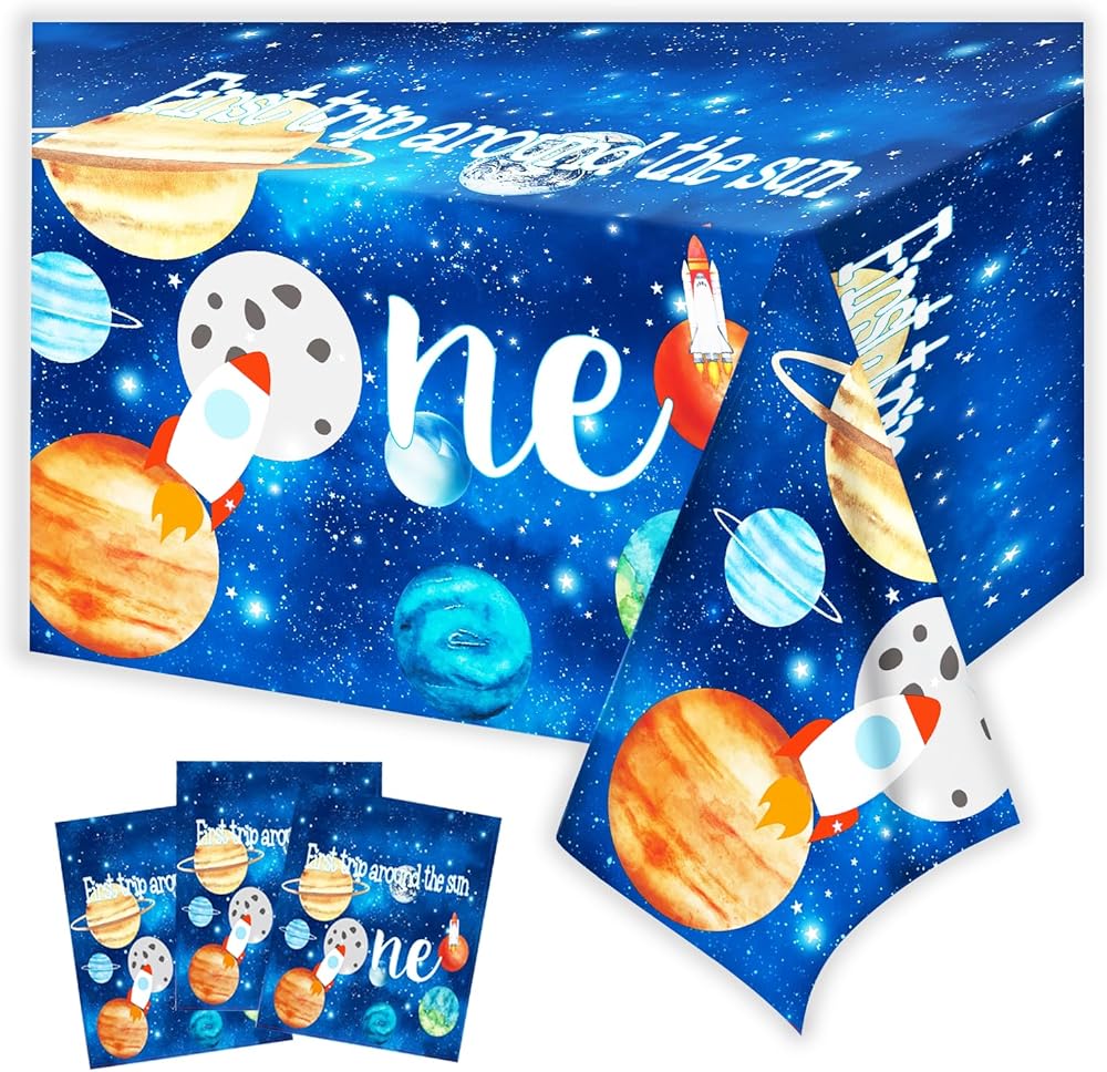 • There are outer space patterns of astronauts, Saturn, Earth, rockets, Neptune, This space galaxy party tablecloths great for many occasions, outer space theme party, kid's 1st birthday party, first trip around the sun party, galaxy astronaut first birthday part.
