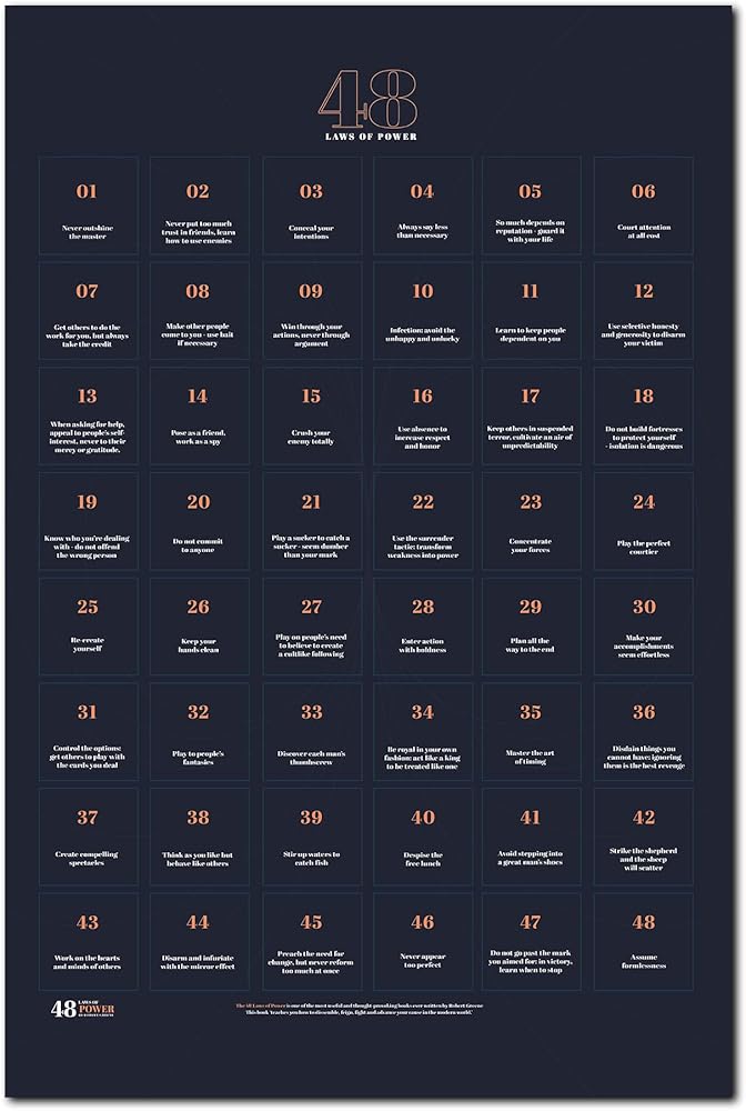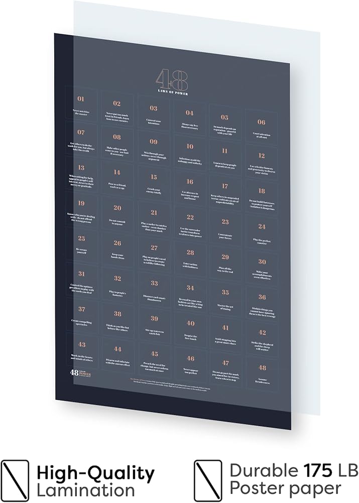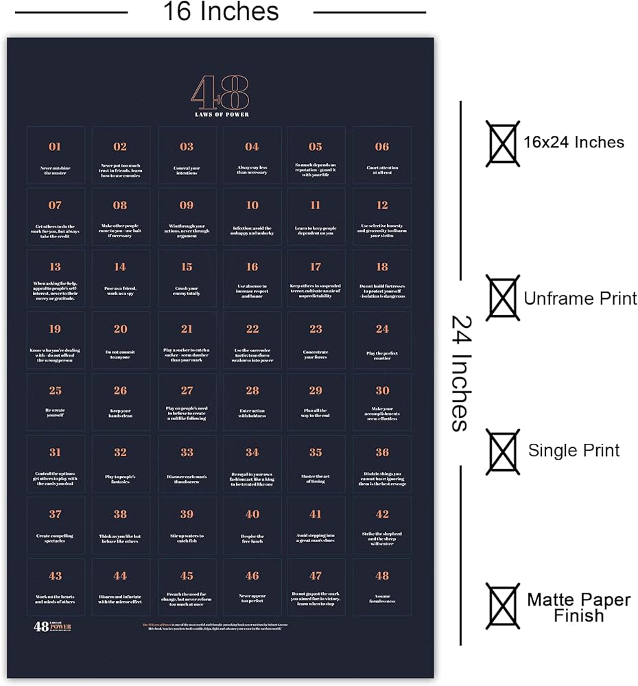 ✅ يساعدنا ملصق تيفوك الذي يسرد 48 قانونًا للطاقة على فهم كيف يمكننا اكتساب القوة ببراعة وتجنب التلاعب بها أو سحقها من قبل الآخرين. تسمح لنا قراءة 48 قانون القوة الذي كتبه روبرت جرين باستكشاف حكم الحياة وفهم ما يجب علينا وما لا ينبغي لنا فعله.
