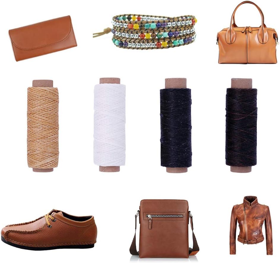 خيوط مغطاة بالشمع: 4 لفات من الجلد بأربعة ألوان مختلفة يمكن أن تلبي جميع احتياجاتك، وهي مغطاة بالشمع وستشد الغرز بسهولة. خيوط الإصلاح الجلدية هذه هي 0.08 سم قطر. الألوان: أبيض، أسود، بني داكن، لون طبيعي.