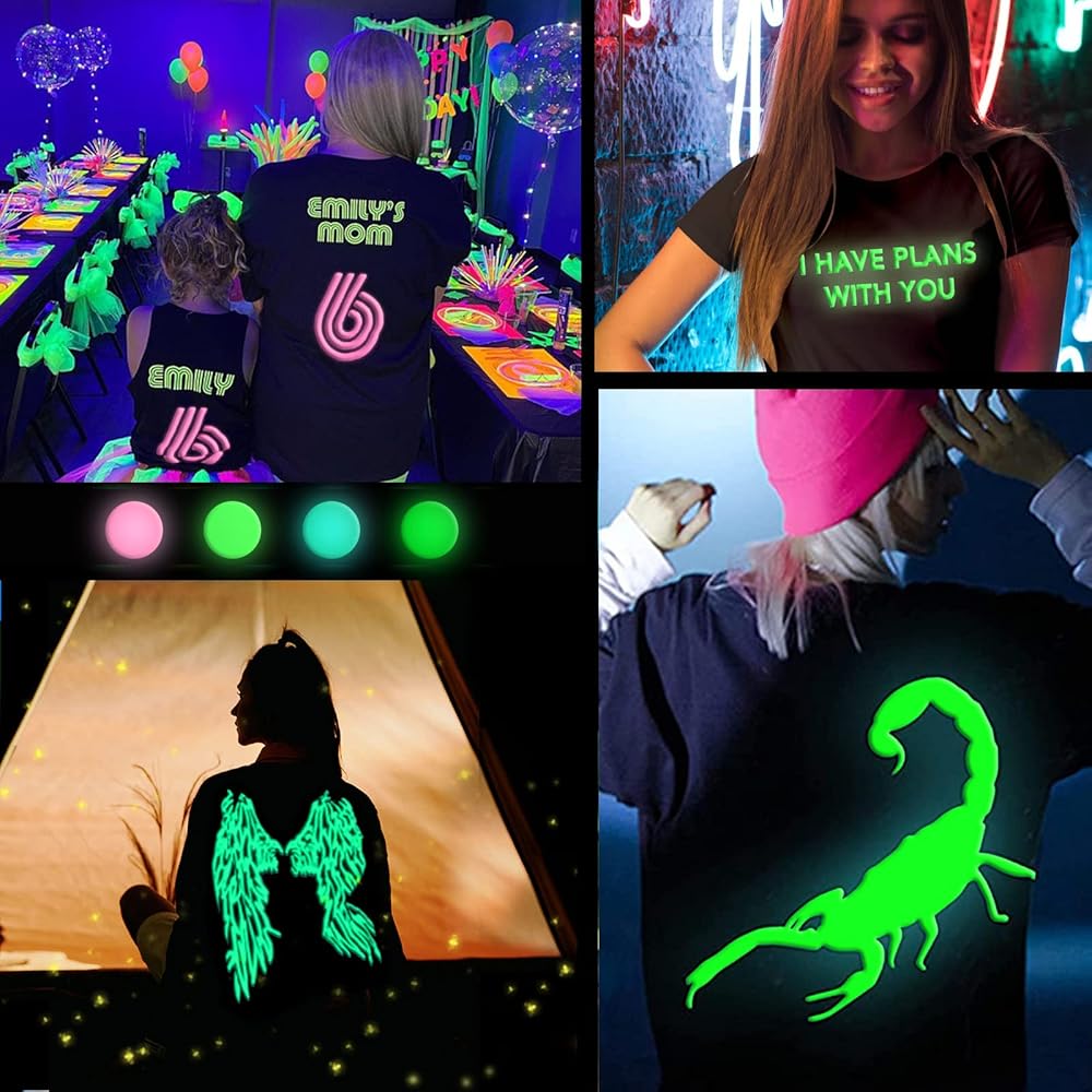 [4 ألوان متنوعة]: نقدم 4 ألوان متنوعة منتفخة تتوهج في الظلام لتتمكن من صنع القمصان والجوارب والحقائب والقبعات والوسائد والمزيد.