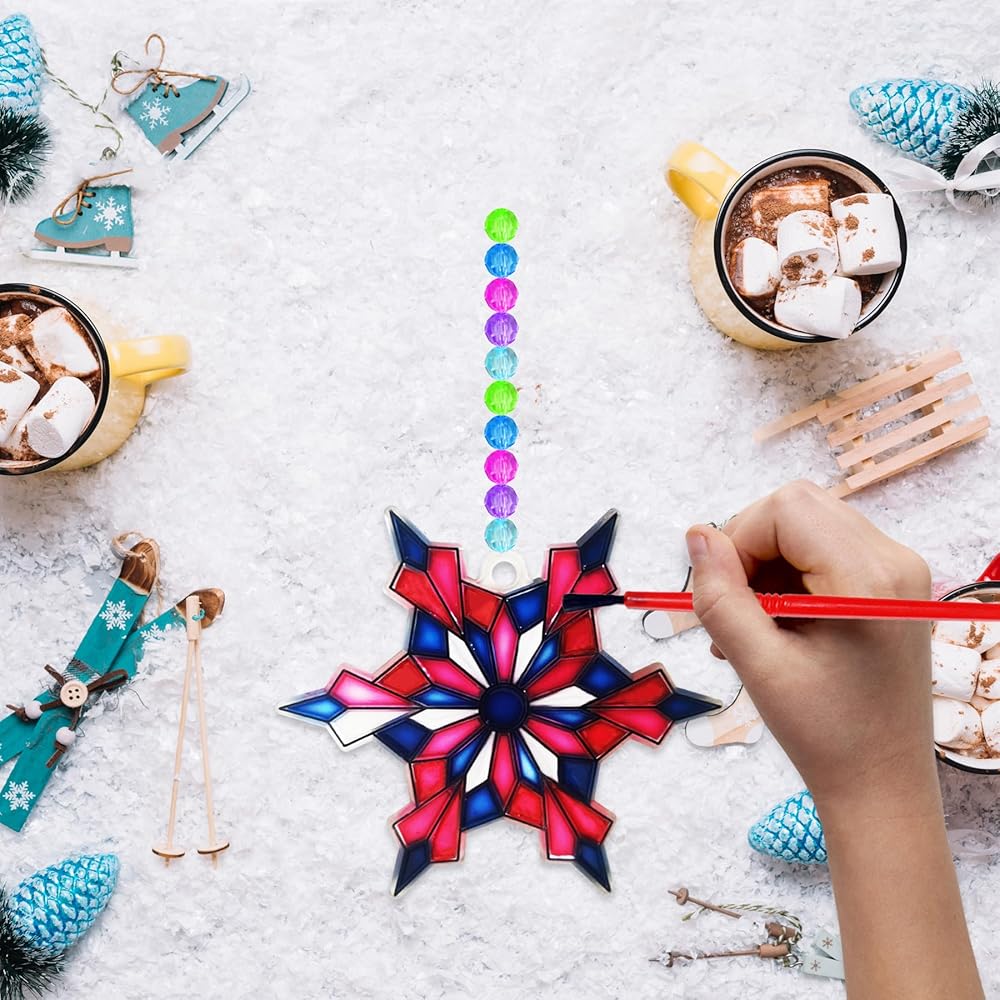 مجموعة الحرف الشتوية: 24 مجموعة من مجموعات حرفية صائدة ندفة الثلج تتضمن 24 قطعة من صائدات الشمس في 4 تصميمات، و10 زجاجات طلاء بخمسة ألوان، و24 فرشاة طلاء، و300 قطعة من الخرز الأكريليك، ولفة واحدة من خيط صيد بطول 393 بوصة، و24 قطعة من خطافات الشفط، كاملة إكسسوارات لسهولة الرسم بنفسك.