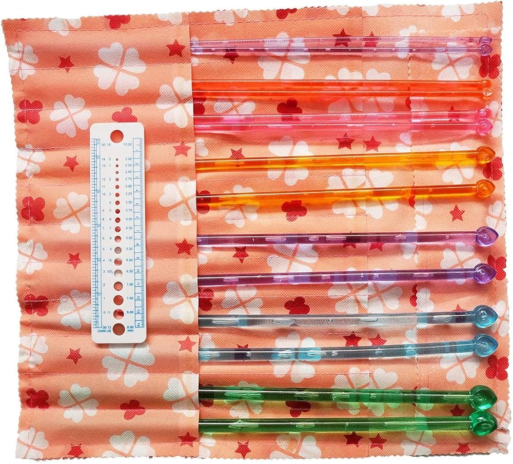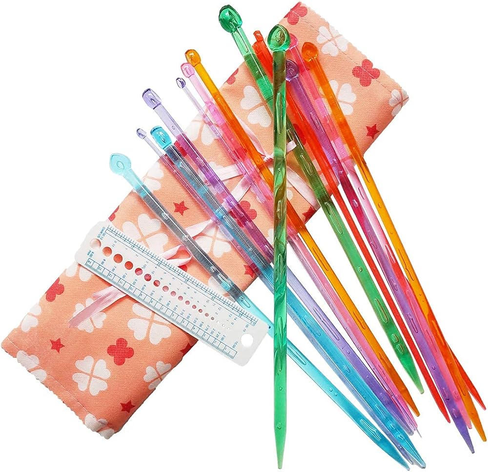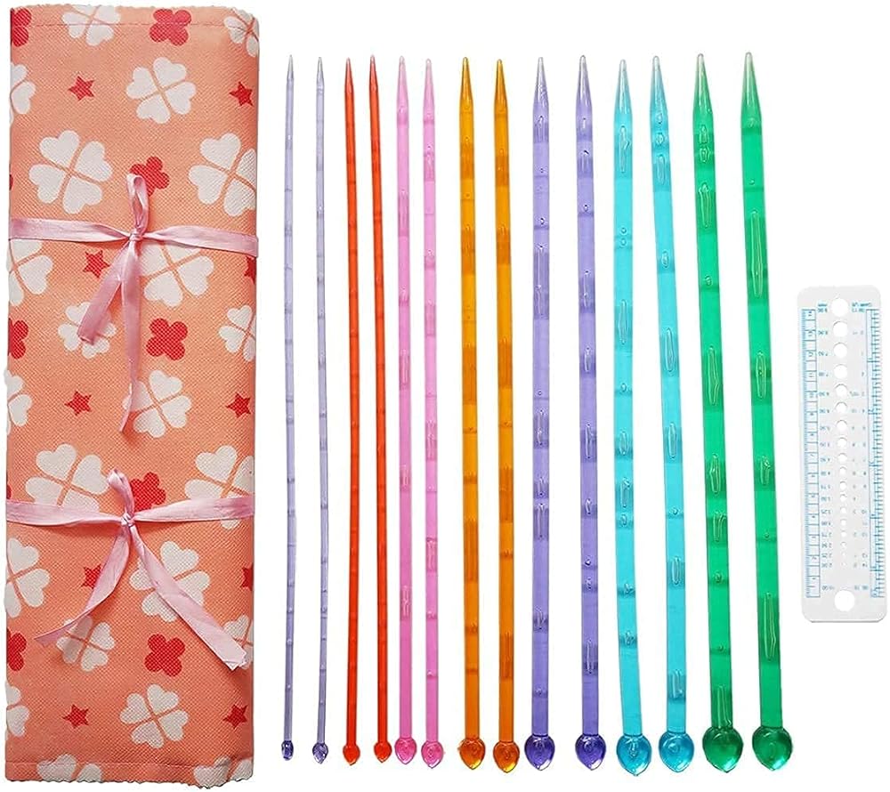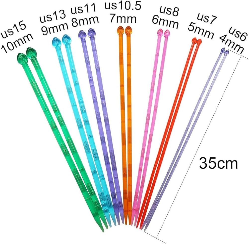 Size: The acrylic knitting needle set includes 7 sizes, which are 6, 7, 8, 10, 11, 13 and 15 in US sizes, which are equivalent to 4, 5, 6, 7, 8, 9, & 10mm.
