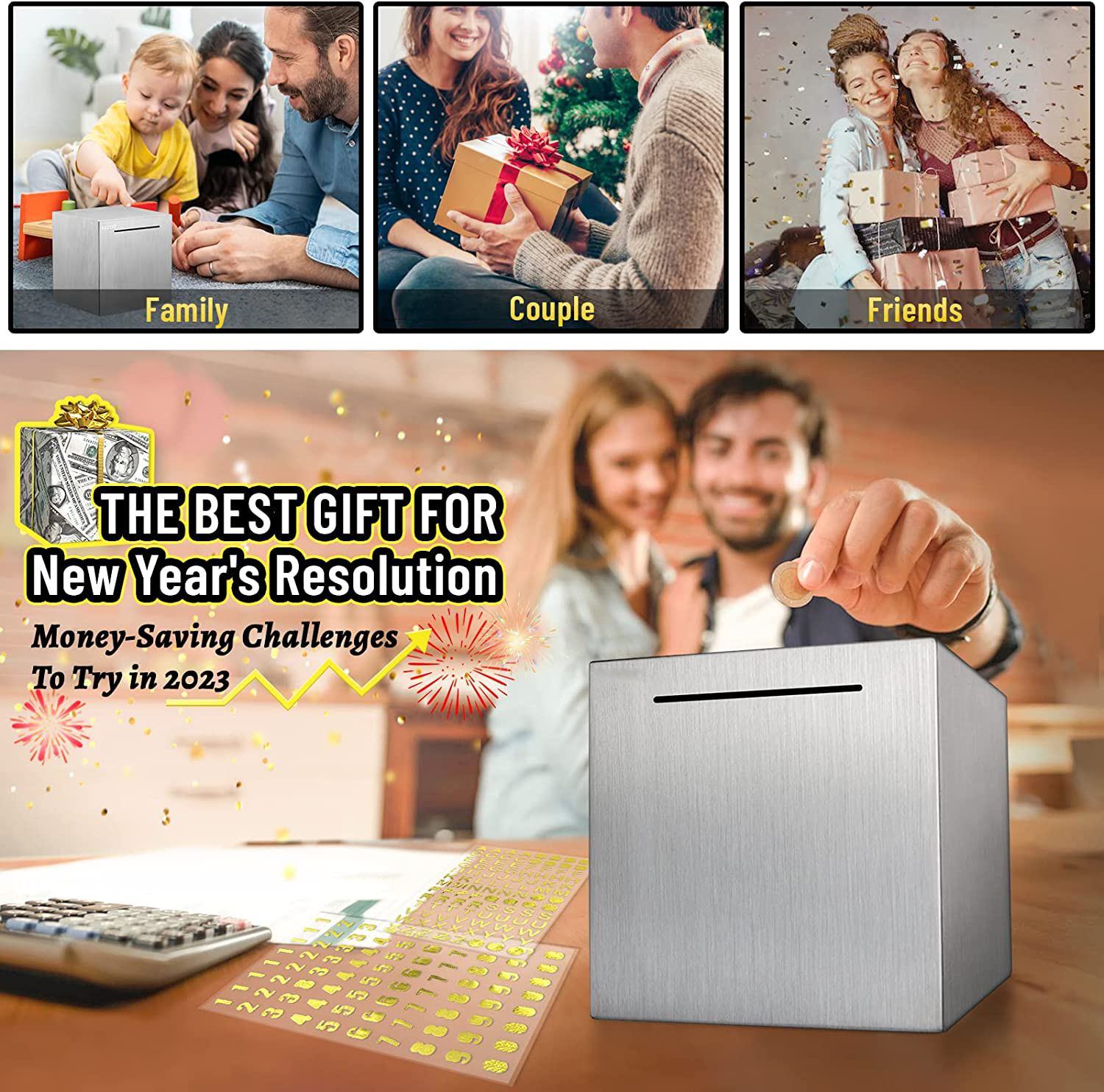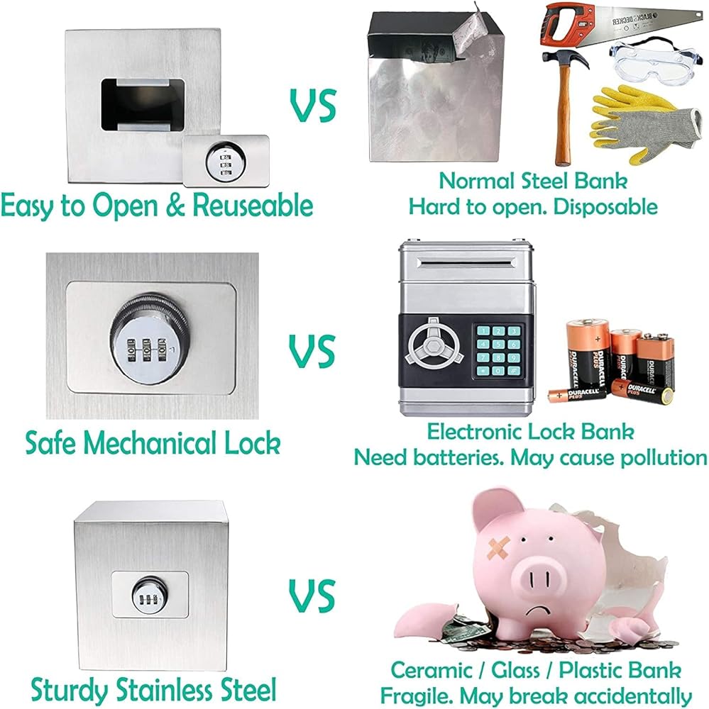【قابلة لإعادة الاستخدام】: على عكس البنوك الخنزيرية المصنوعة من الفولاذ المقاوم للصدأ المكعبة العادية أو غيرها من البنوك المالية المفتوحة والمدمرة للبالغين، مع القفل المركب المكون من 3 أرقام، يمكنك فتح البنك الخنزيري الخاص بنا برمزك الشخصي، وبالتالي استخدامه عدة مرات. للعديد من خطط الادخار