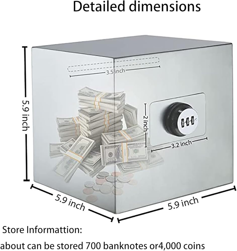 【بنك ذو سعة كبيرة】: يحتوي صندوق التوفير المعدني على حجمين وألوان تلبي احتياجات الجميع، متوسط، كبير، فضي، وأسود. يحمل كل بنك معدني مدخرات مختلفة. أبعاد هذا البنك الأسود المتوسط هي 5.9 بوصة × 5.9 بوصة × 5.9 بوصة. يمكنه تخزين حوالي 4000 عملة معدنية أو 700 عملة ورقية بكامل طاقتها. يرجى اختيار الحجم المناسب قبل الشراء