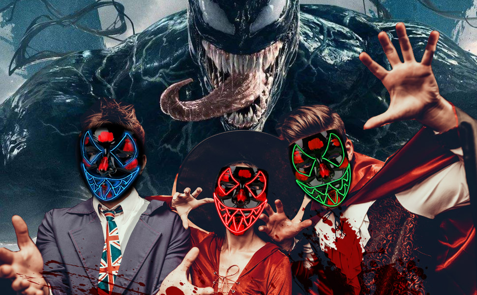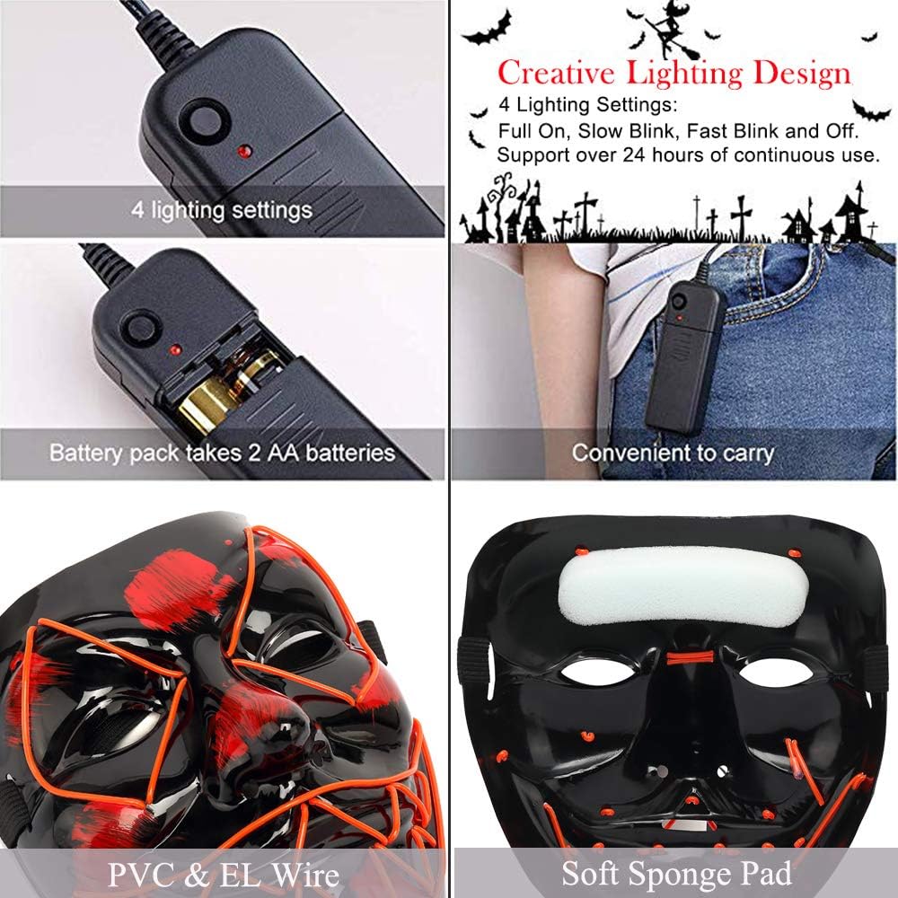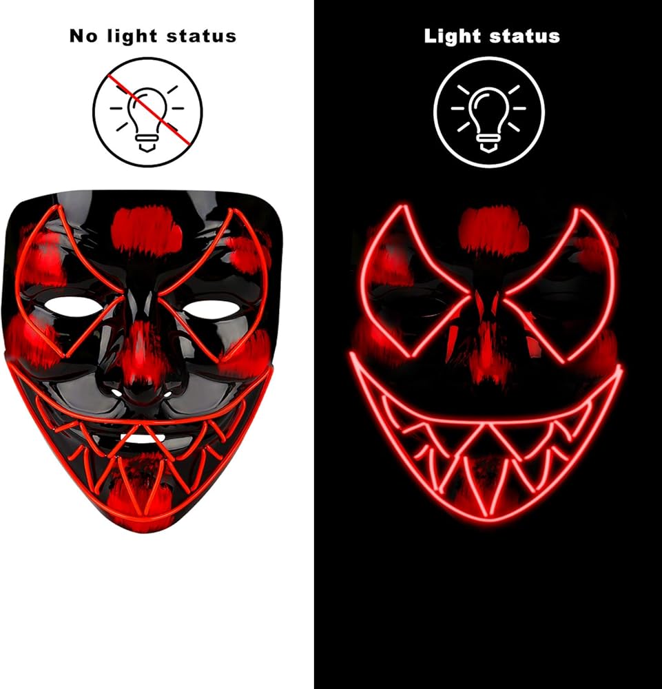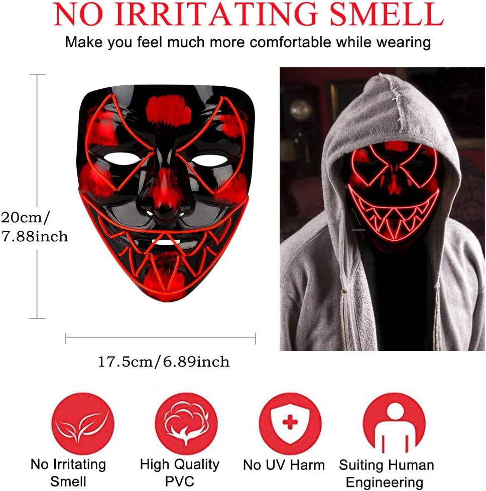 💀 تصميم قناع الهالوين مستوحى من الفيلم. تم نسج مصابيح LED في القناع المصنوع من بلاستيك أكريليك غير لامع مما يسمح للقناع بأن يدوم لفترة أطول ويكون أكثر متانة. ولا يتكون من أي أشعة فوق البنفسجية ضارة وقد ثبت أنه ليس له أي آثار ضارة على جسم الإنسان.