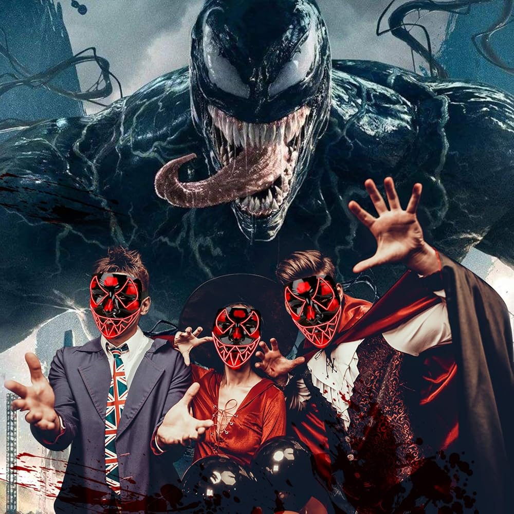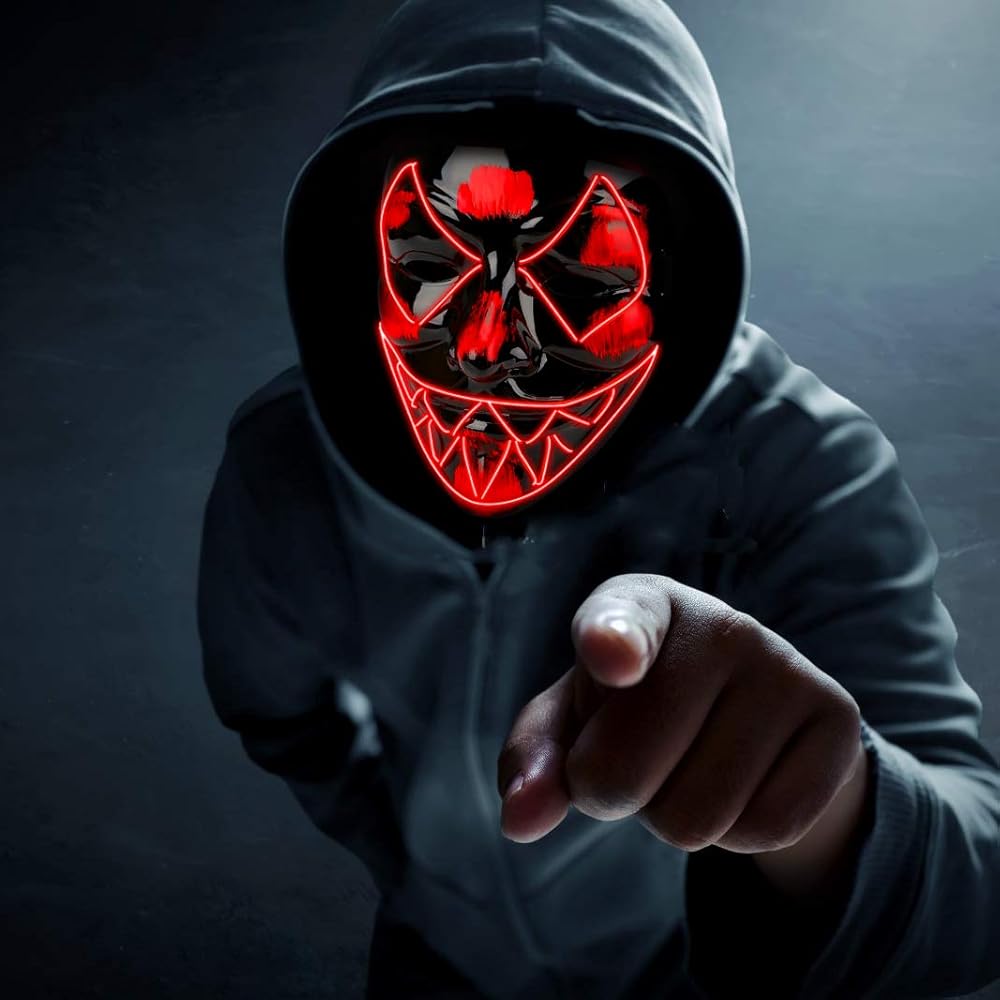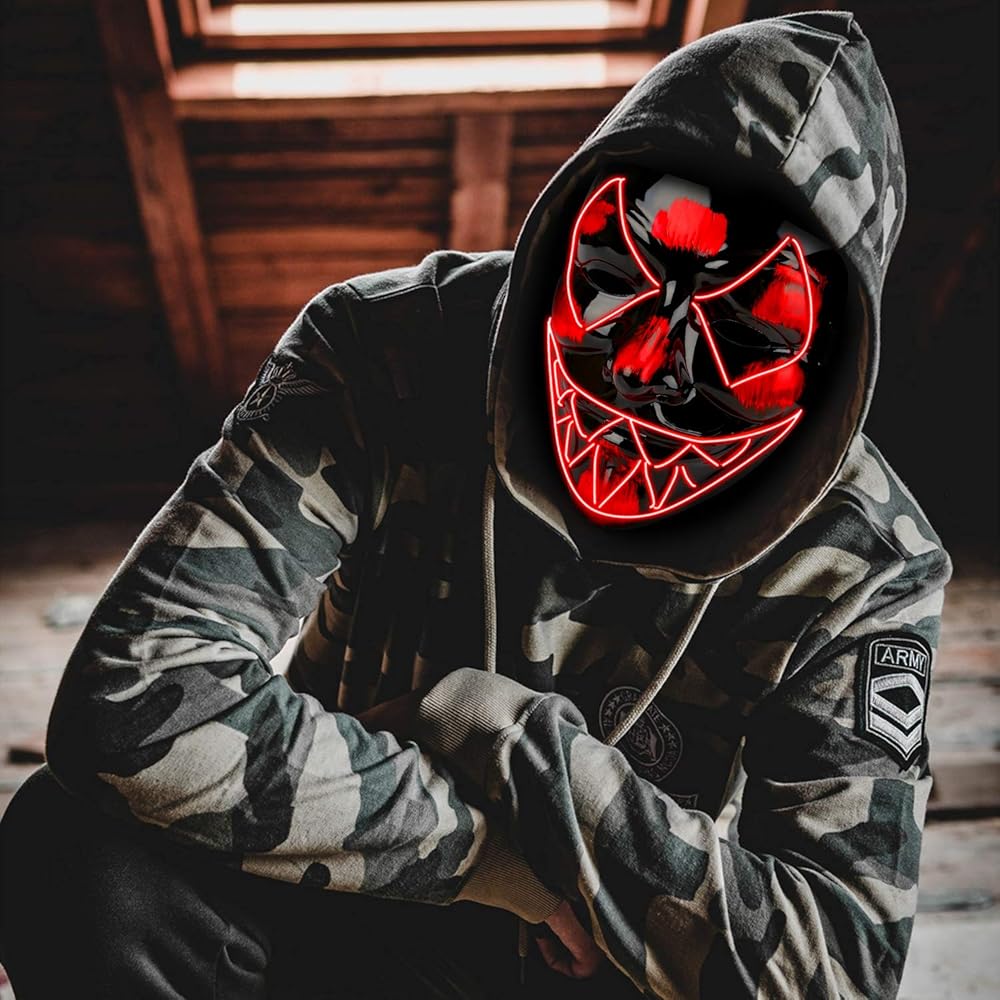 💀 تصميم قناع الهالوين مستوحى من الفيلم. تم نسج مصابيح LED في القناع المصنوع من بلاستيك أكريليك غير لامع مما يسمح للقناع بأن يدوم لفترة أطول ويكون أكثر متانة. ولا يتكون من أي أشعة فوق البنفسجية ضارة وقد ثبت أنه ليس له أي آثار ضارة على جسم الإنسان.