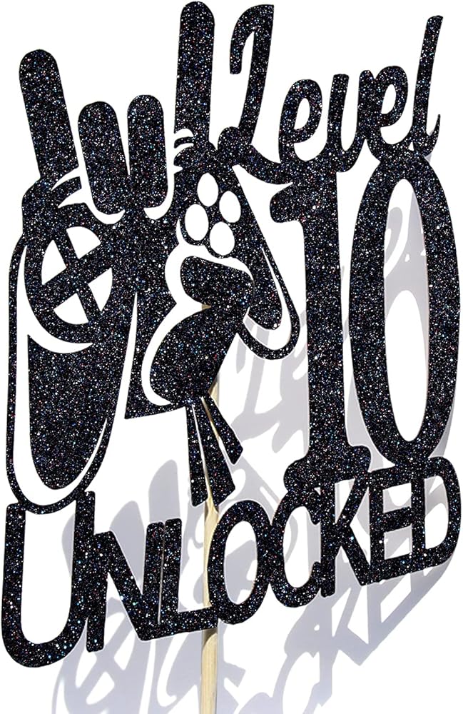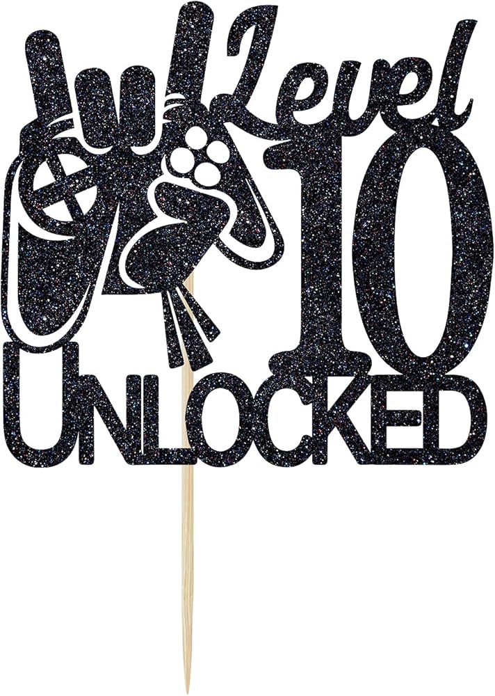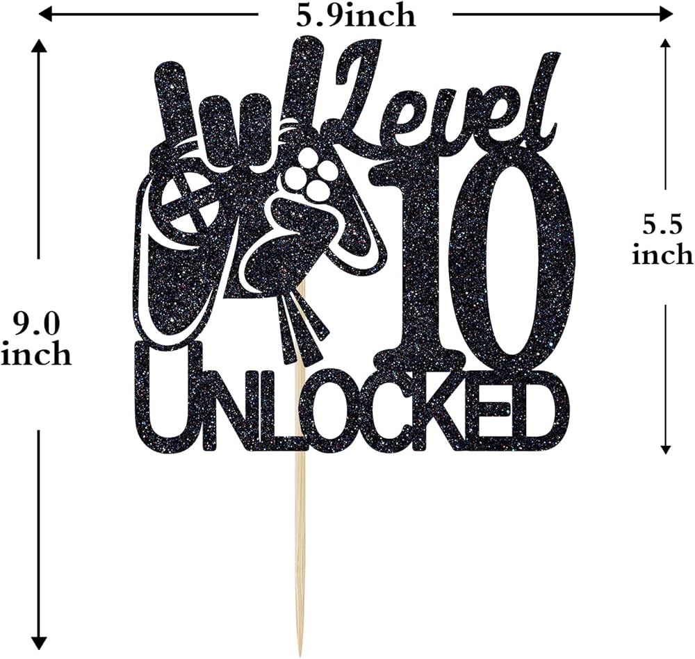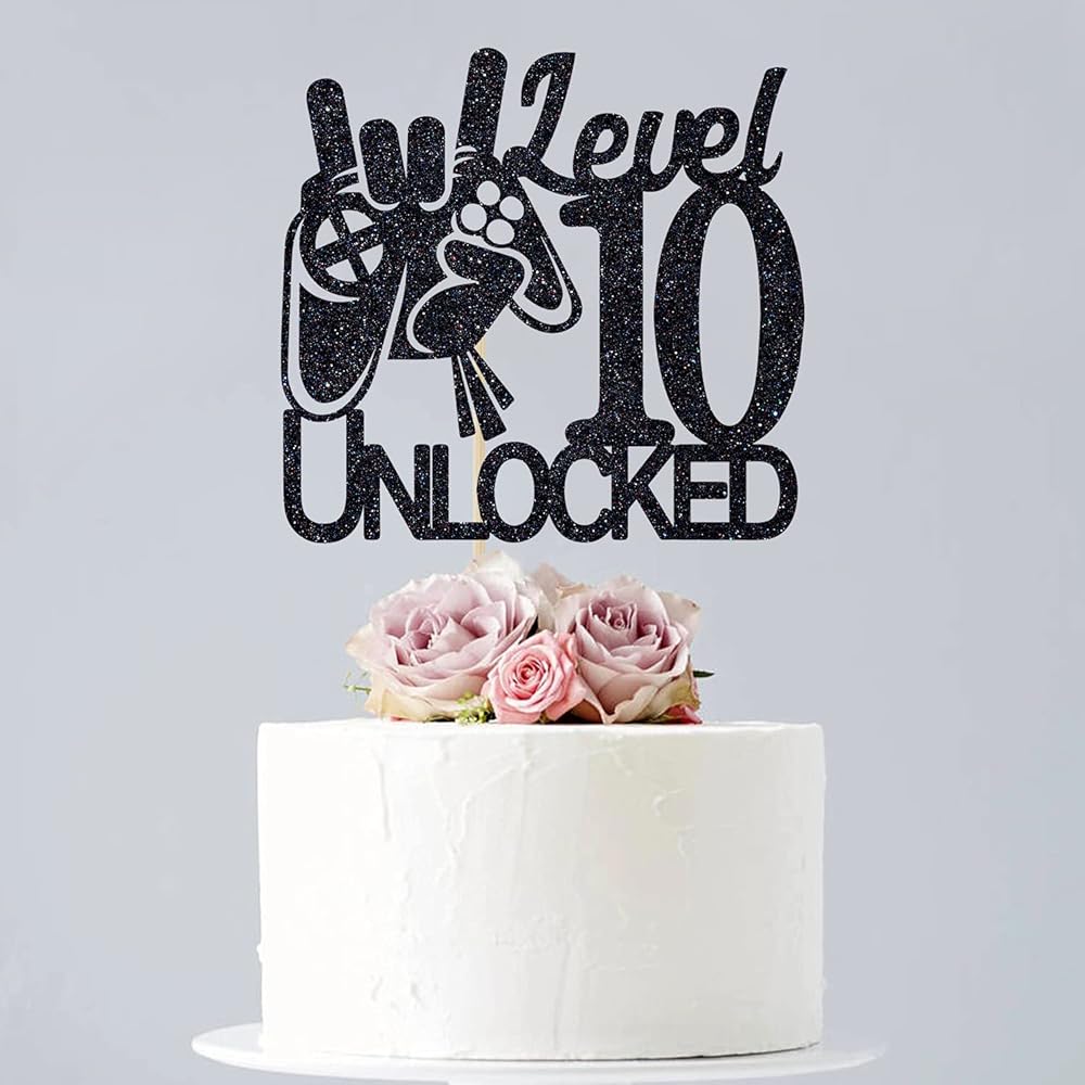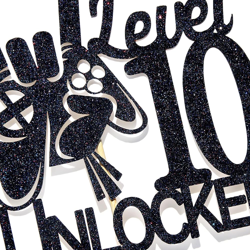 غلاف كعكة عيد الميلاد غير مقفل بتصميم لعبة الفيديو المستوى 10 - ديكورات كعكة عيد الميلاد العاشر للأولاد اللامعة باللون الأسود - مستلزمات تزيين الحفلات الفائزة بمستوى أعلى