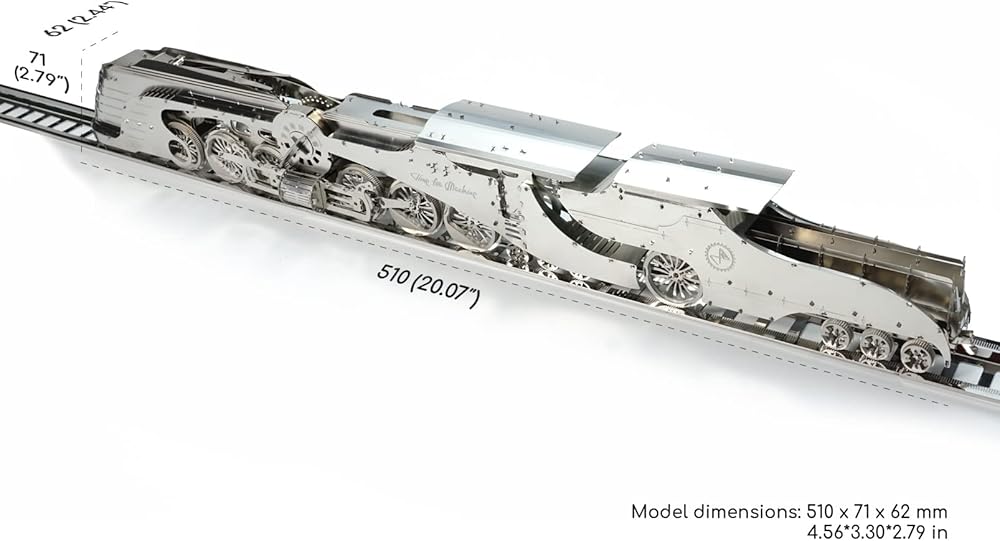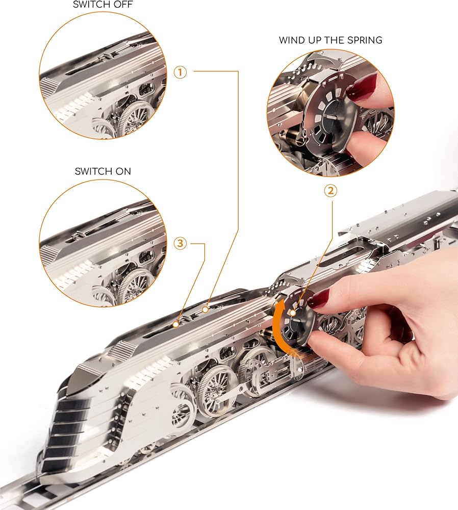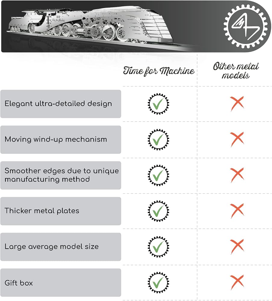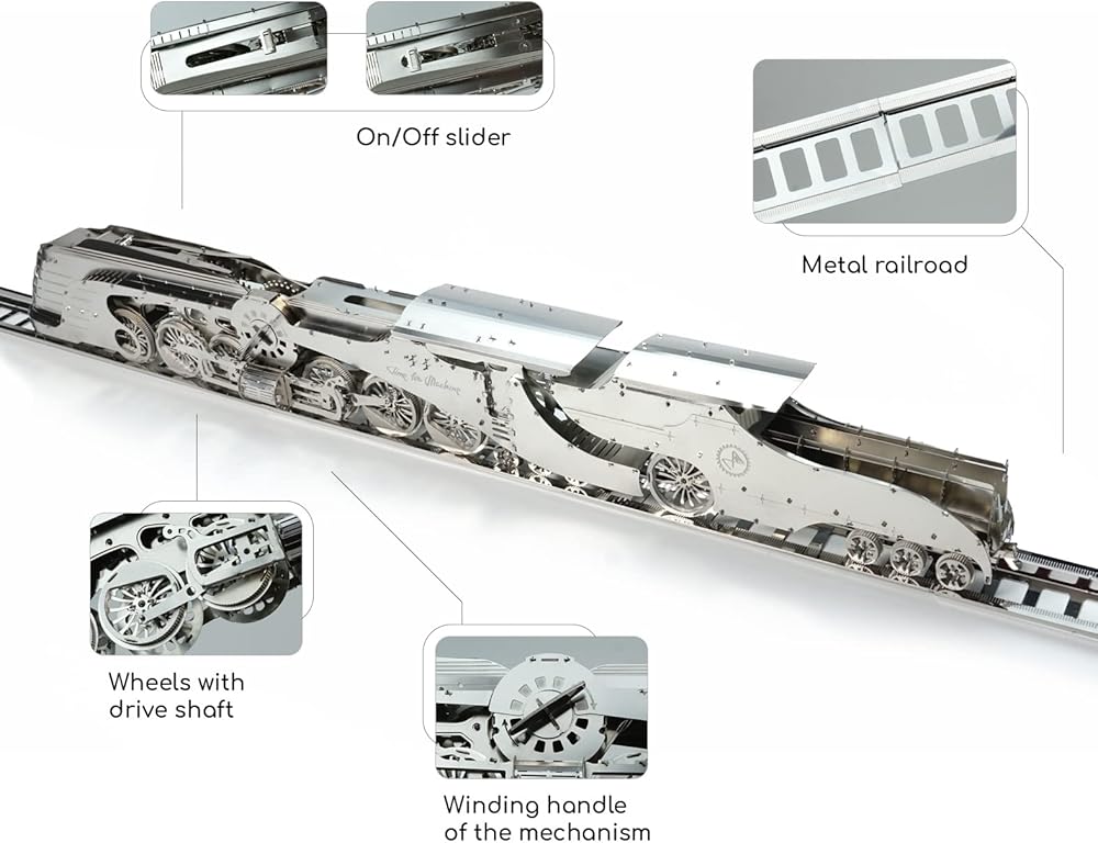 مجموعة نموذج قطار مقياس Steamliner المبهر من تايم فور ماشين : يحتوي هذا القطار النموذجي على آلية لف متحركة بناءً على تطوراتنا الفريدة. يتميز الموديل بتصميمات أكثر أناقة وجذابة بصريًا وعالية الجودة. يتحرك القطار على المسارات بعد لفه. يمكنك تجميعها من الستانلس ستيل عالي الجودة والعملية ممتعة حقًا! نظرًا لجماله العتيق، فإن نموذج القطار القابل للتجميع الخاص بنا يمثل هدية مثالية (يتضمن صندوق هدايا!) لأي عشاق النماذج أو أي شخص يحب الديكورات الأنيقة للمكاتب أو أرفف الكتب أو الديكورات الداخلية! لقد وضعنا معايير عالية لمجموعات النماذج الخاصة بنا والألغاز ثلاثية الأبعاد والمجموعات التي تصنعها بنفسك بسبب الجودة (ومتعتك!) مهم بالنسبة لنا. ثلاث ميزات رئيسية فريدة: تصميم قطار فاخر جميل بشكل لا يصدق من المعدن آلية متحركة وأجزاء تفاعلية على عكس العديد من الموديلات الأخرى، ستانلس ستيل عالي الجودة وعملية يدوية مرضية