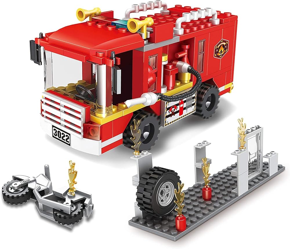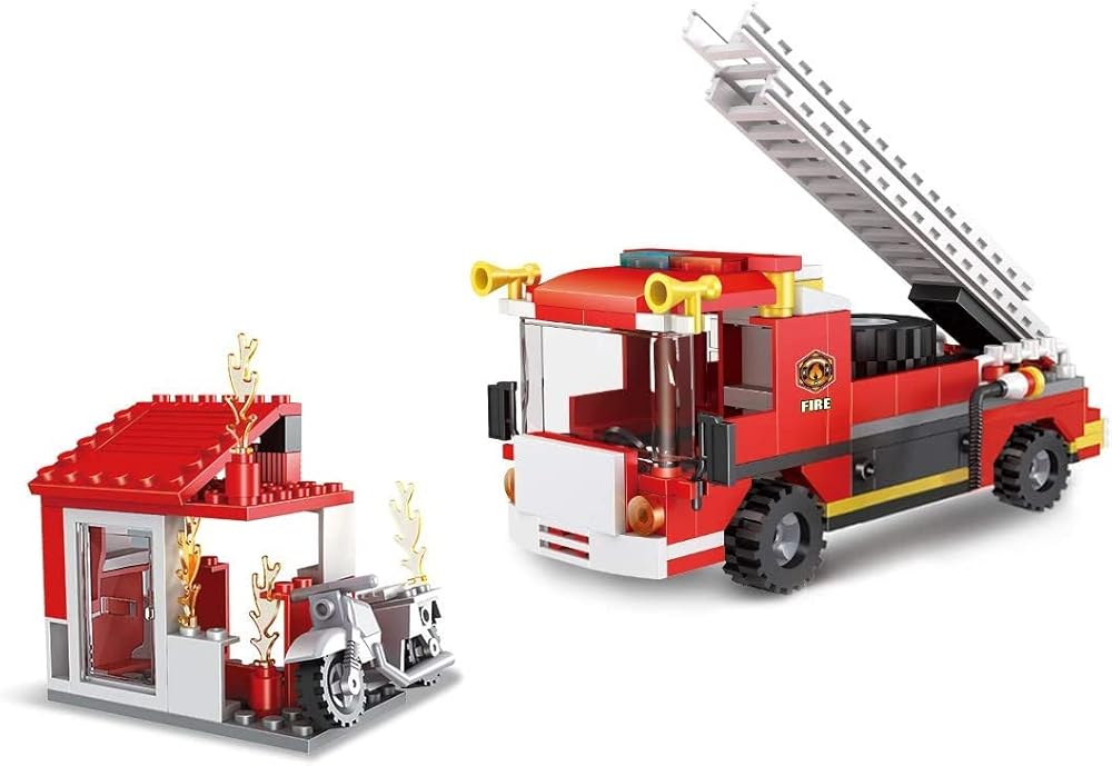 تتميز مجموعة بناء شاحنة الإطفاء بشاحنة إطفاء مع باب خلفي مفتوح، وسلم إطفاء مستهلك، ومدفع مياه ونظام ألوان كلاسيكي باللون الأحمر والأسود والأصفر. تشتمل الملحقات على منزل مع عنصر لهب قابل للبناء ودراجة نارية ورجل إطفاء يوفر للأطفال تجربة لعب أدوار مثيرة.