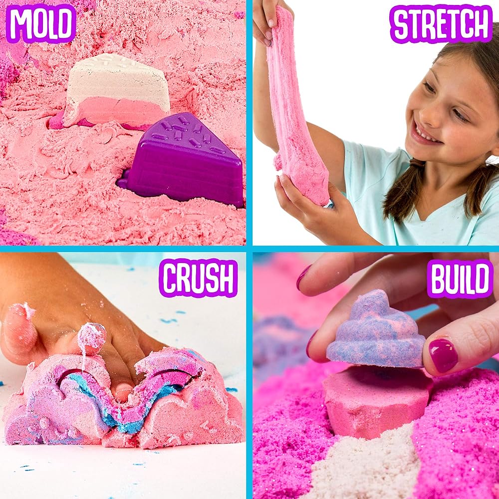 حلوى سليميساند، 2 رطل من SlimySand في 5 ألوان (بريق وردي، بريق أبيض، وردي، أزرق وأرجواني)، 6 قوالب ثلاثية الأبعاد وصندوق قابل لإعادة الاستخدام للعب. سلايم سحابي فائق التمدد وقابل للتشكيل!