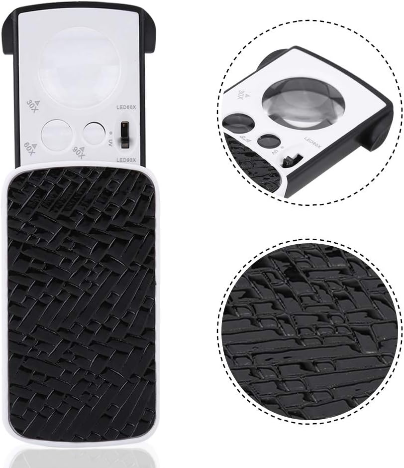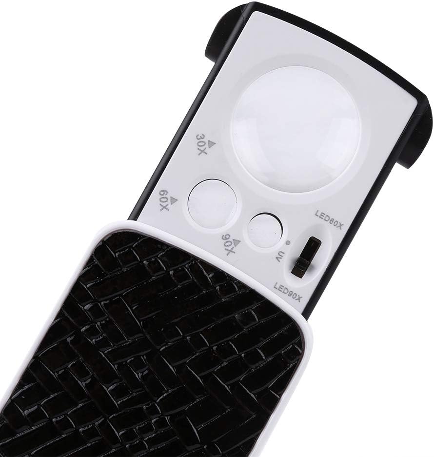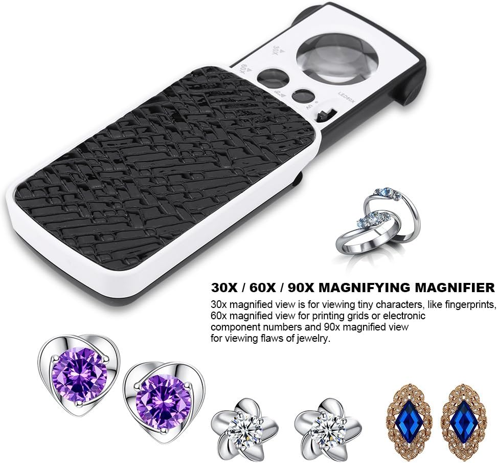مادة ABS وPU آمنة وصديقة للبيئة ومتينة. يمكن للعدسة البصرية ذات الوضوح العالي تكبير كل تفاصيل المجوهرات أو الطوابع أو العملات المعدنية أو غيرها للحصول على تقييم أفضل. العرض المكبر 30x مخصص لعرض الأحرف الصغيرة، مثل بصمات الأصابع، والعرض المكبر 60x لشبكات الطباعة أو أرقام المكونات الإلكترونية والعرض المكبر 90x لعرض عيوب المجوهرات. 3 مصادر إضاءة مختلفة لأغراض مختلفة. مثالية للمجوهرات والطوابع والتقييم النقدي، إلخ.