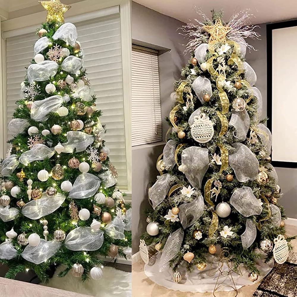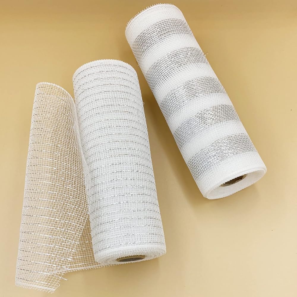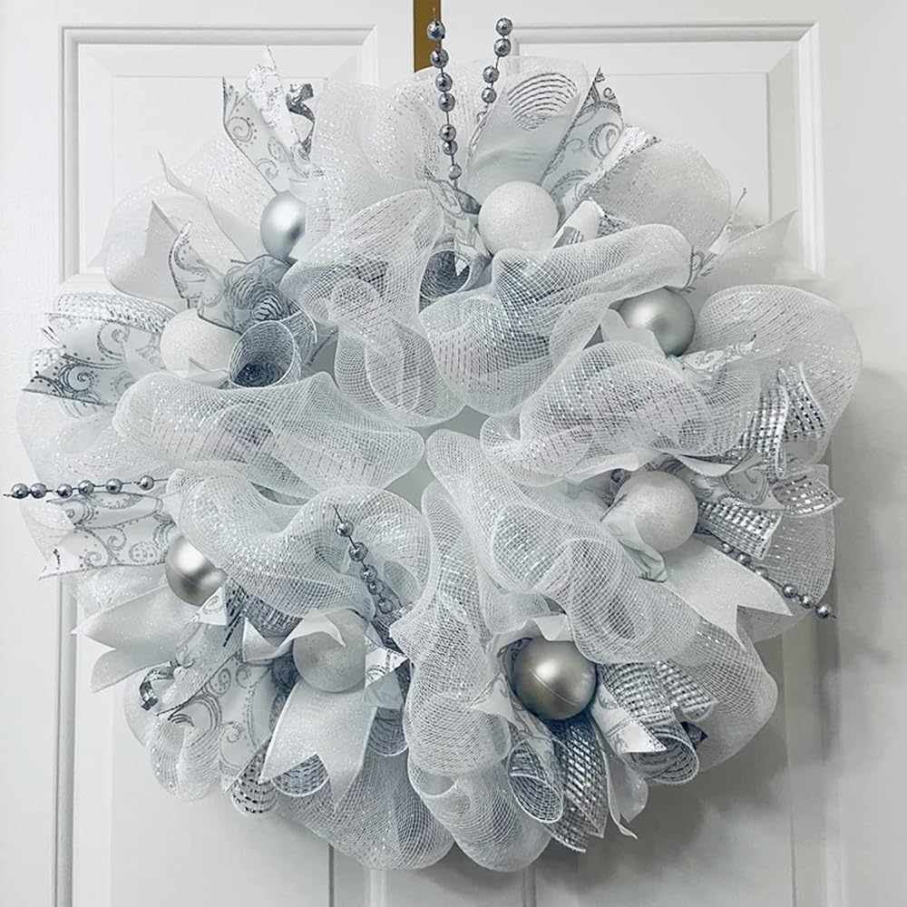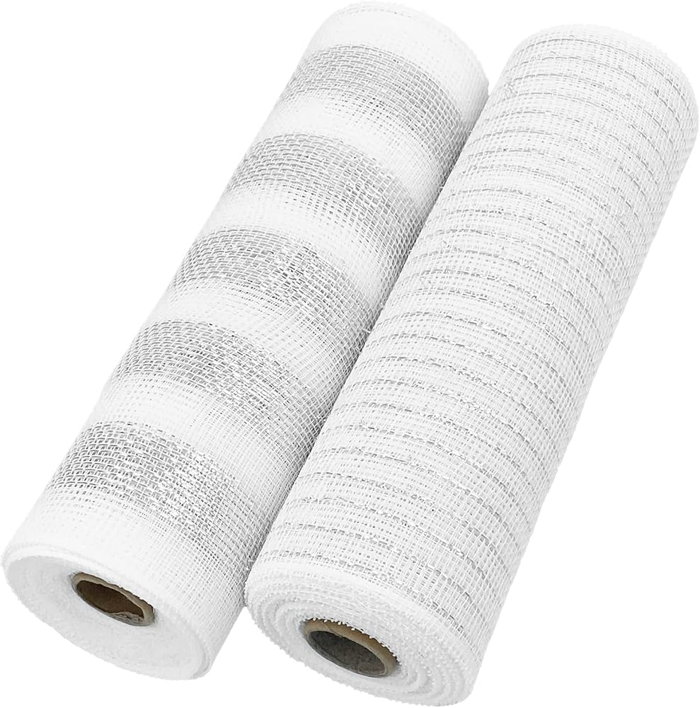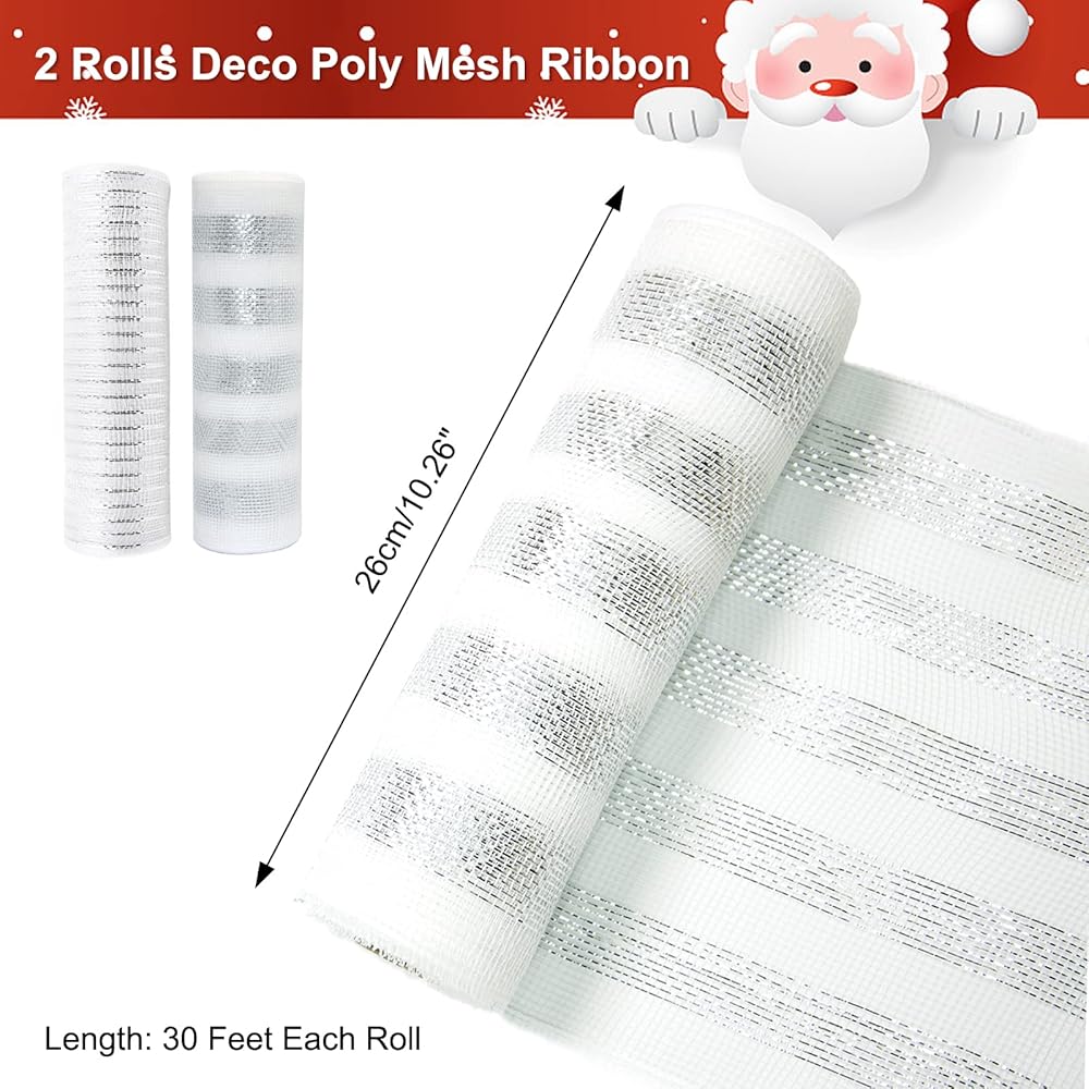 2 لفات من شبكة ديكو لعيد الميلاد، 10 ياردات فضية وبيضاء معدنية من شريط شبكي بولي لأكاليل الزهور، شريط شبكي لشجرة عيد الميلاد، إكليل، ديكور المنزل إكليل