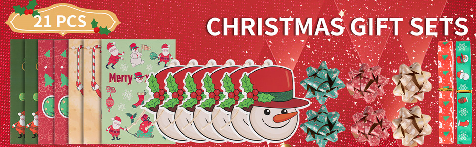 21 قطعة من أقواس وشريط تغليف هدايا عيد الميلاد، 6 أقواس عيد الميلاد، شريطين هدايا عيد الميلاد، 6 بطاقات هدايا، 6 بطاقات عيد الميلاد، ملصق واحد لديكورات هدايا عيد الميلاد (مع صندوق هدايا أحمر)
