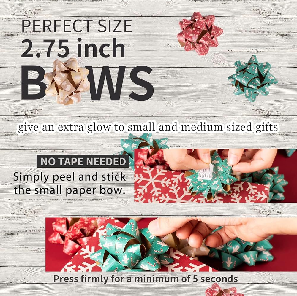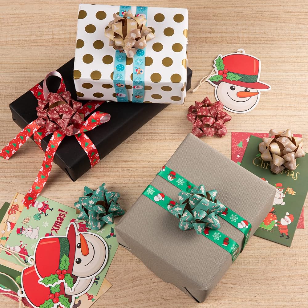 PREMIUM CHRISTMAS BOWS, TAGS, CARDS, STICKER AND RIBBON - These mini holiday bows, christmas tags, cards with blank sheet to write your wishes, and 2 roll wide christmas ribbon are the perfect way to decorate your presents this holiday. Also, the bows come in an assortment of holiday colors and festive patterns, with biodegradable paper textures.