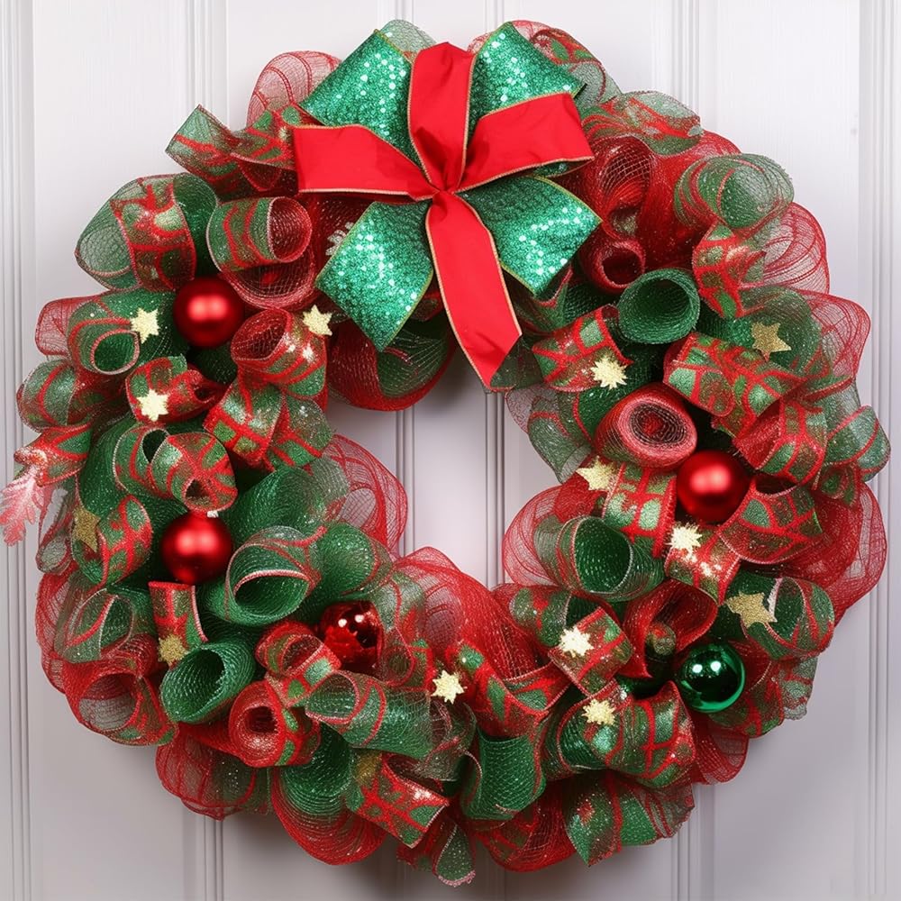 2 لفات ديكور أحمر شبكة ديكور أخضر شبكة عيد الميلاد شبكة معدنية شريط ديكور شبكي شريط شبكي معدني أحمر وأخضر لمستلزمات الأعمال اليدوية DIY إكليل شجرة عيد الميلاد (10 بوصة، 10 ياردة)