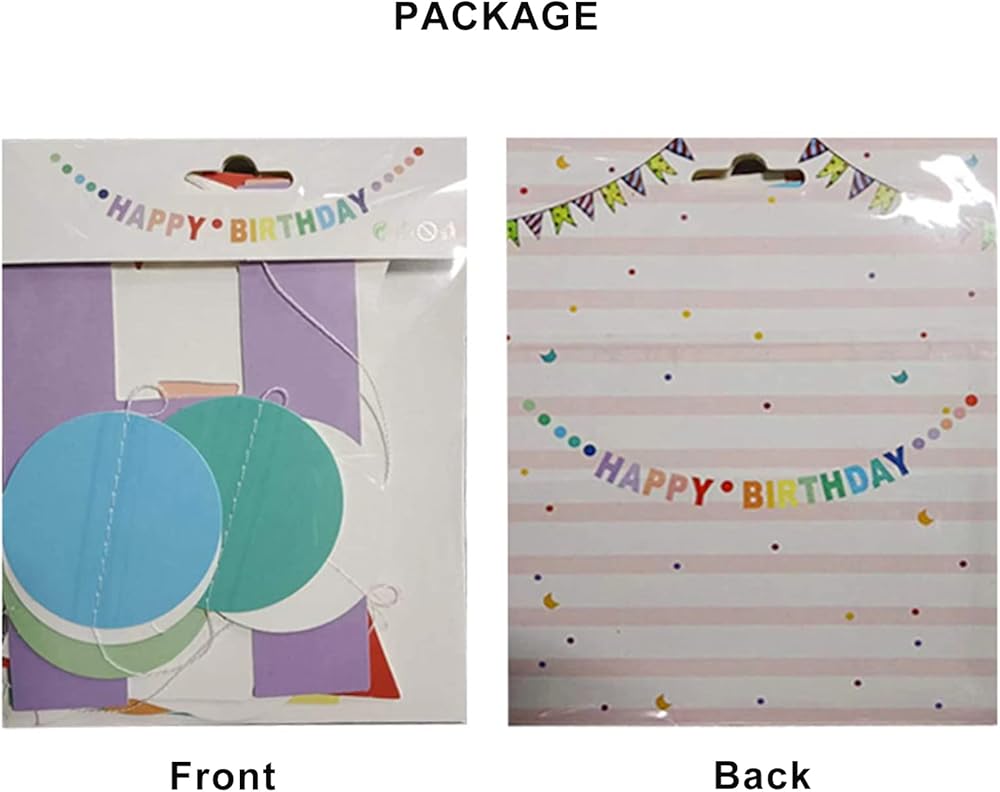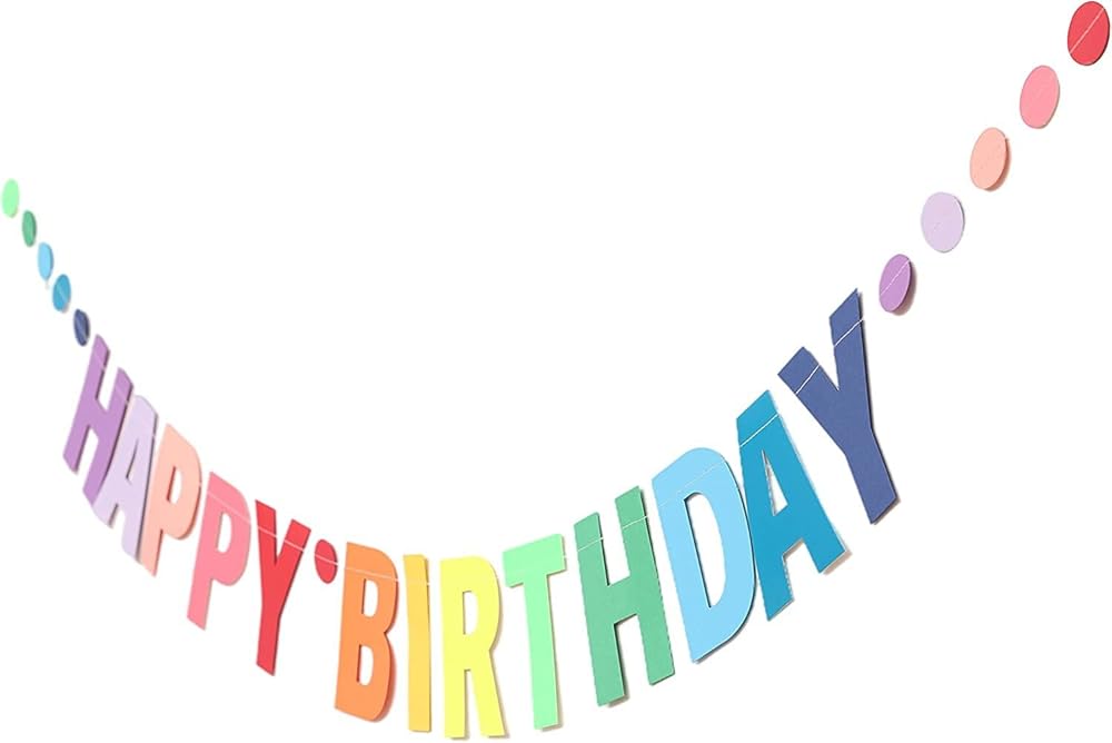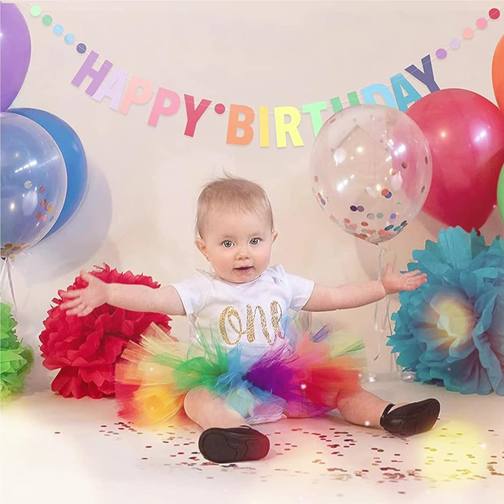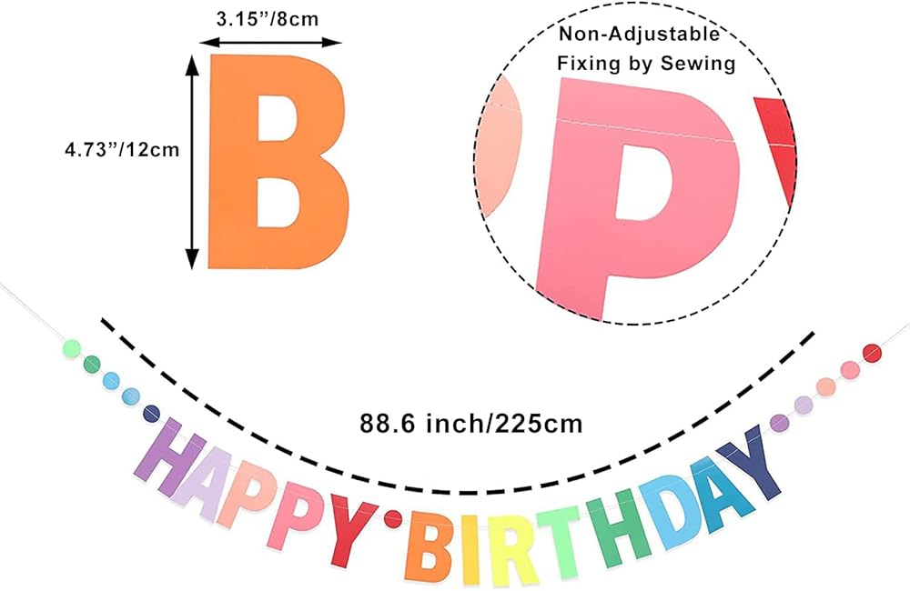 The Rainbow birthday banner for women, men, kids set includes a HAPPY BIRTHDAY letters and 11 units colorful dots, included green, blue, navy, rose, red, pink, orange,purple, yellow.