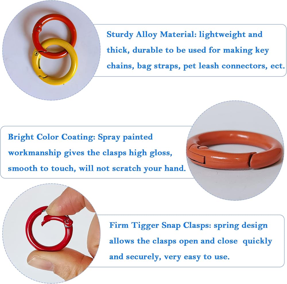 • مادة فاخرة - مشبك الإغلاق الدائري مصنوع من خليط معدني موثوق، قوي ومتين للاستخدام، ليس من السهل كسره، تم رشه بألوان زاهية، ناعم وله مقاومة كبيرة للتآكل والصدأ.