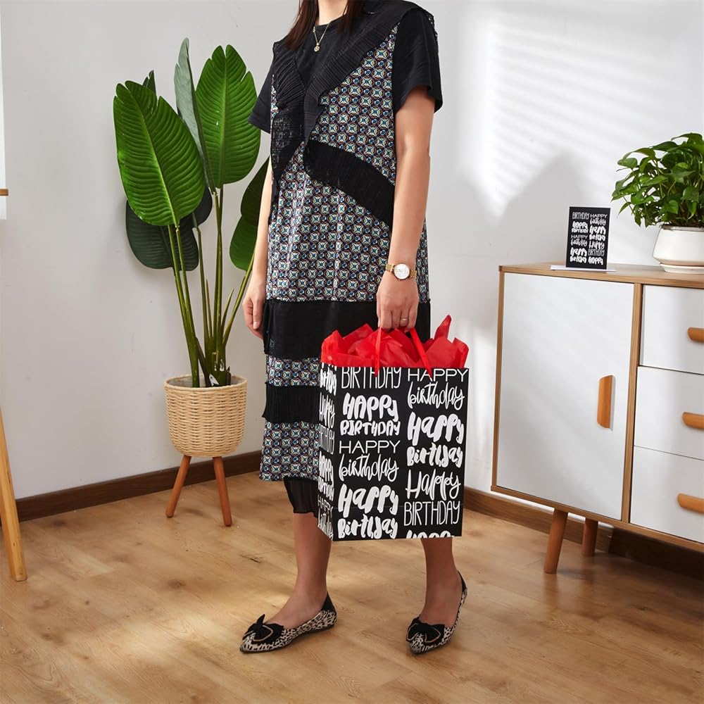 حقيبة هدايا عيد الميلاد السوداء الكبيرة هذه مع 3 ورقات من المناديل الورقية الحمراء. تأتي حقيبة الهدايا مع مقابض شريطية وبطاقة تهنئة يمكنك من خلالها كتابة أطيب تمنياتك.