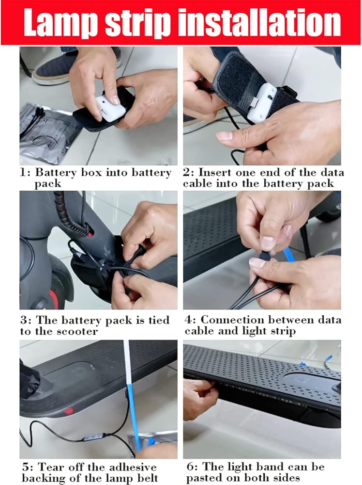 【تركيب سهل】ملحقات سكوتر لاصقة على الجزء الخلفي من حزام المصباح. ضع اللاصق على شريط المصباح لمدة 1-2 دقيقة، ثم قم بلصق شريط المصباح. قم بتركيب صندوق البطارية، قم بتوصيل شريط مصباح الاختبار الخاص بمصدر الطاقة. صندوق البطارية متصل بالسيارة وتم الانتهاء من التركيب.