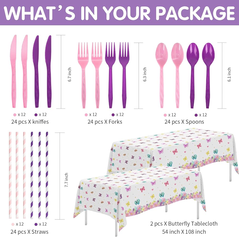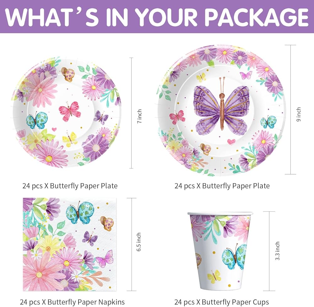 【What Will You Get】Our butterfly baby shower decorations dinnerware set included 24pcs 9'' dinner party plates, 24pcs 7'' dessert party plates, 24pcs napkins, 24pcs cups, 24set cutlery, 24pcs paper straws, 2pcs butterfly theme table cover, for butterfly party supplies