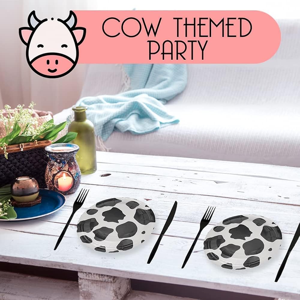 ستكون الأطباق المضحكة على شكل بقرة إضافة رائعة لحفلتك التي تحمل طابع البقرة ومفرش طاولة مطبوع عليه بقرة والتي تقف عليها كعكة مع قطعة علوية للكب كيك على مناديل بقرة لطيفة مع لافتة بقرة على الخلفية