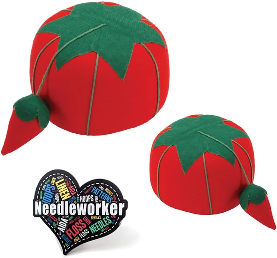 • INCLUDES: 2 Tomato Pin Cushions With Strawberry Emery. 4 inch and 2.5 inch sizes. Includes a fun 2 inch ‘Needleworker' Sticker for display!