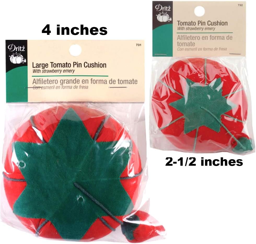 INCLUDES: 2 Dritz Tomato Pin Cushions With Strawberry Emery. 4 inch and 2.5 inch sizes. 1 decorative ‘Needleworker' Sticker for display.