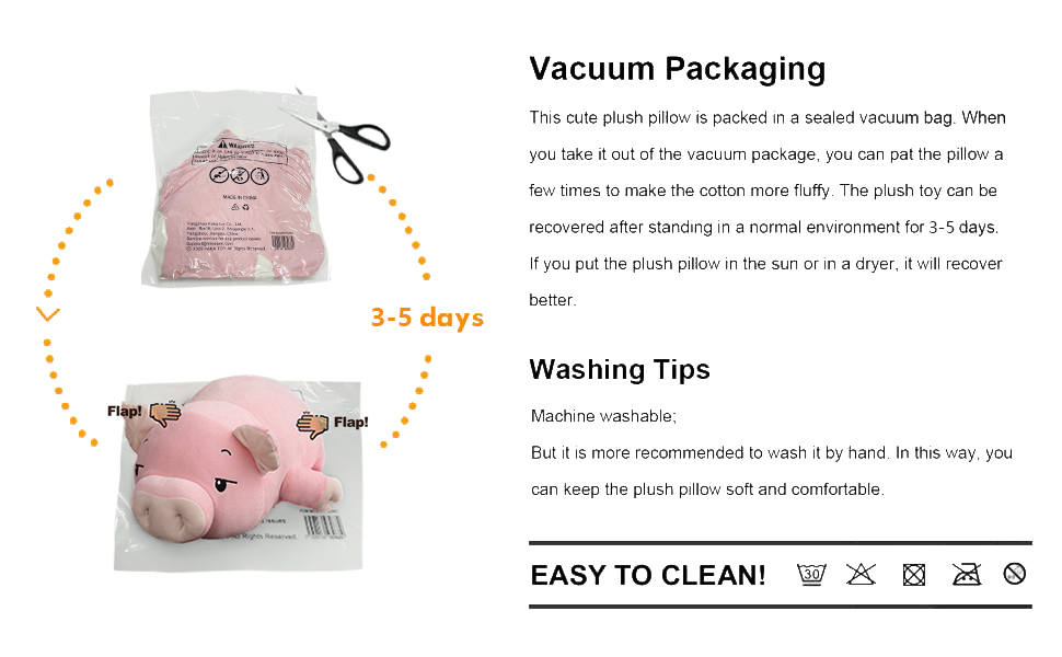 تغليف بالتفريغ: هذه الوسادة القطيفة اللطيفة معبأة في كيس مفرغ مغلق. عند إخراجها من العبوة المفرغة، يمكنك التربيت على الوسادة عدة مرات لجعل القطن أكثر انتفاخًا. يمكن استعادة اللعبة المحشوة بعد وقوفها في بيئة عادية لمدة 3-5 أيام. إذا وضعت الوسادة الفاخرة في الشمس أو في المجفف، فسوف تتعافى بشكل أفضل.