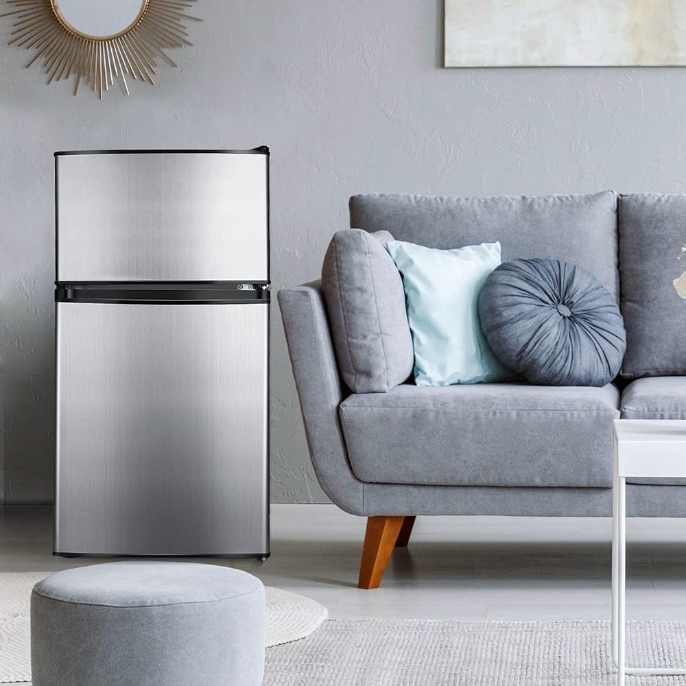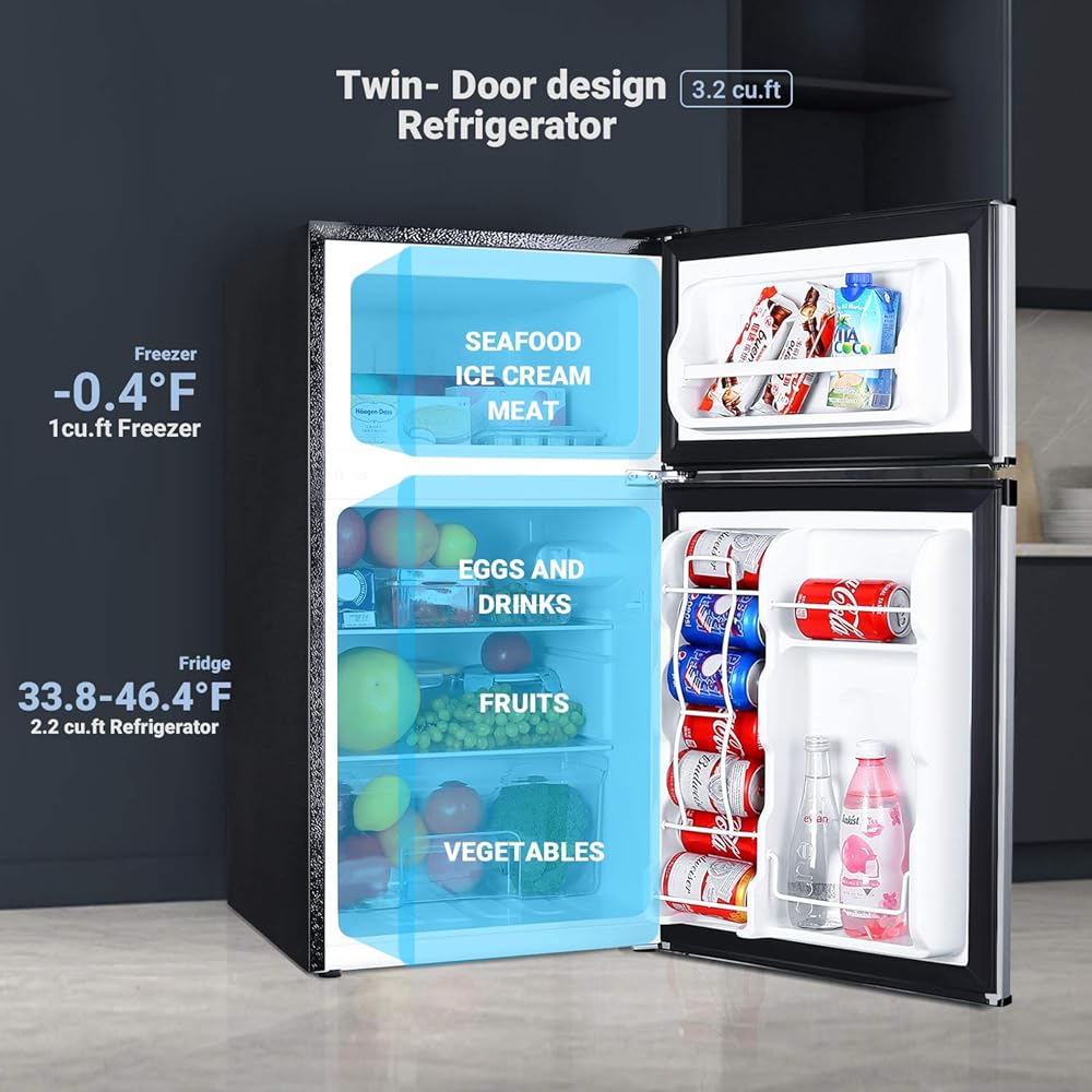 TWO DOOR FRIDGE WITH FREEZER: 3.2 Cu.ft capacity, the dimensions is: 17.5 in. × 19.5 in. × 33.8 in, compact size while taking up small space; 1.0 cu.ft freezer, the space is larger than other refrigerators of the same type, can be used storage your ice cream or frozen food, 2.2 cu.ft refrigetore, with a crisper drawer, sufficient space to keep drinks, fruits, vegetables ect cool and fresh ADJUSTABLE TEMPERATURE: The small refrigerator compartment has 5 settings adjustable thermostat control ranges from 33.8' to 46.4' Fahrenheit. And the freezer compartment can keep -0.4'F, perfect to store your chocolate, meat, and ice cream. comes with a crisper drawer which can better reduce the water loss of fruits and vegetables and keep them fresh for longer CONSIDERATE DESIGN: 2-door design, makes the refrigeration and freezing completely separate to meet your needs to the maximum; removable glass shelves, can be adjusted to place tall bottle, like milk and 2L of Cola; Leveling Leg helps to placed steadily on uneven ground; LED interior lighting puts a natural spotlight on food of your under counter ADVANCE TECHNOLOGY: Equipped with a powerful and efficient compressor R600a, excellent quality, making the small refrigerator operates efficiently; at the same time, it's virtually undetectable, quietly at 37dB, won't interrupt your work or study, perfect for the office, dorm, apartment, dormitory, garage, college dorm THOUGHTFUL SERVICE: Everything is designed to enhance your experience and meet your needs! If you encounter any problems during use, please feel free to contact us and we will respond back to you 24hours a day /7days a wee