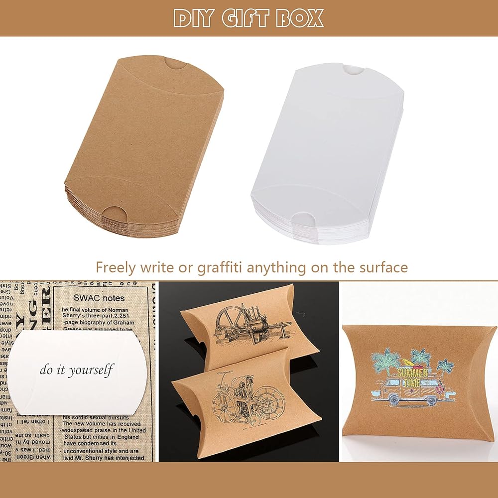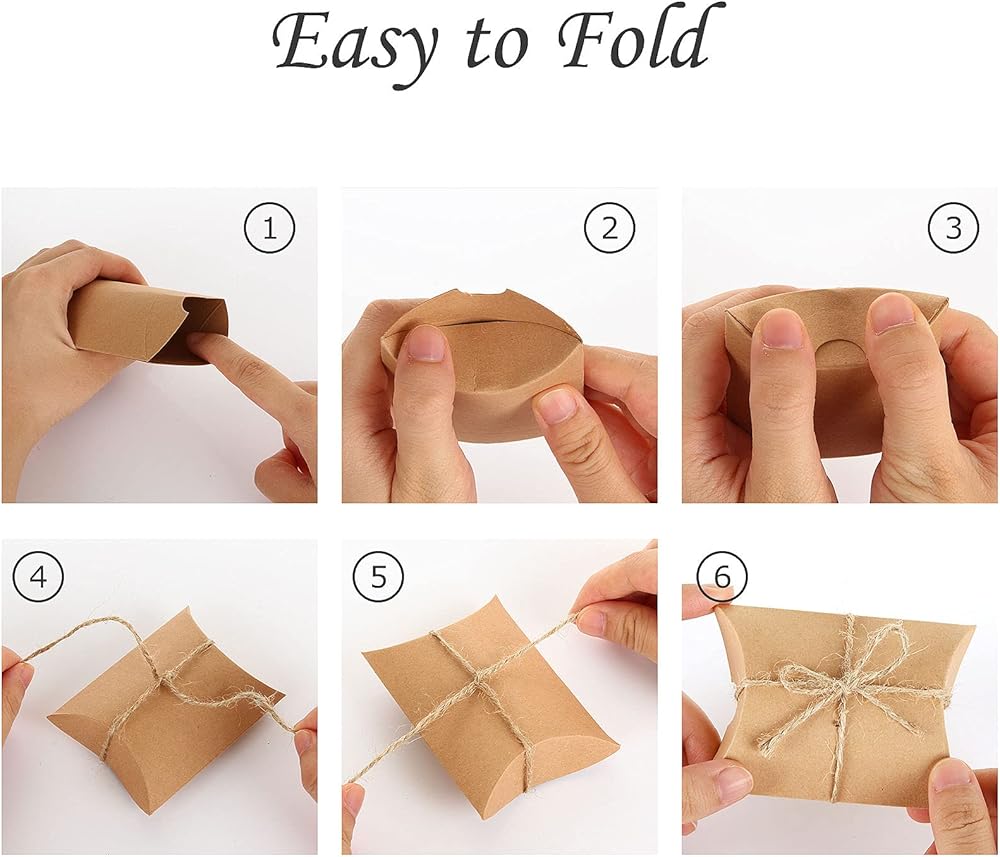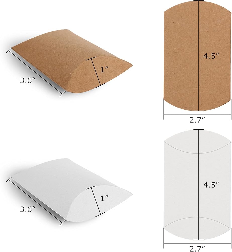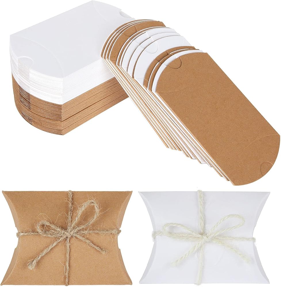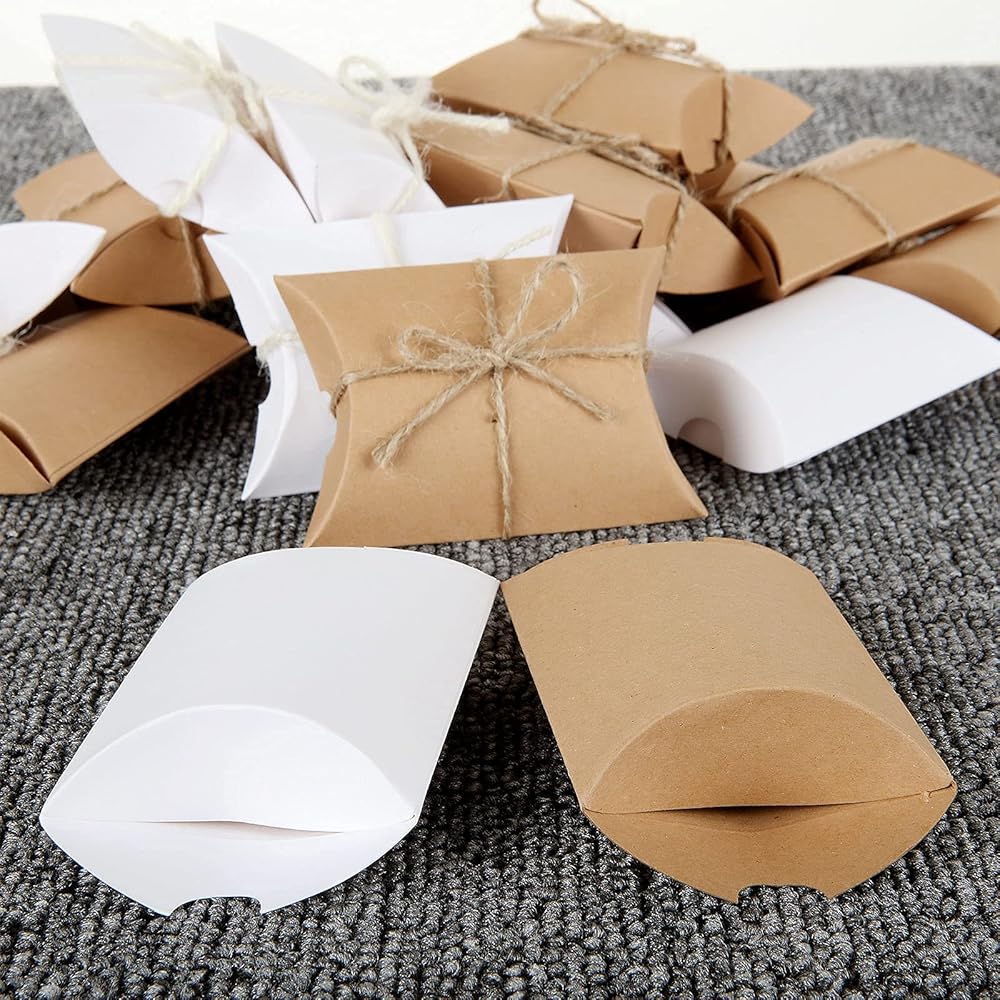 FVIEXE 200Pack Kraft Pillow Boxes, Small Pillow Gift Boxes with Jute Twines, Mini Pillow Candy Box Paper Gift Box for Jewelry, Craft, Birthday Party Favor, Wedding Present and Gift Packaging, White / Brown (3.6x2.7x1 Inch)