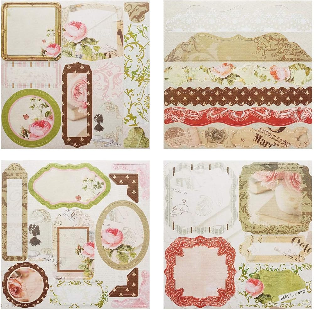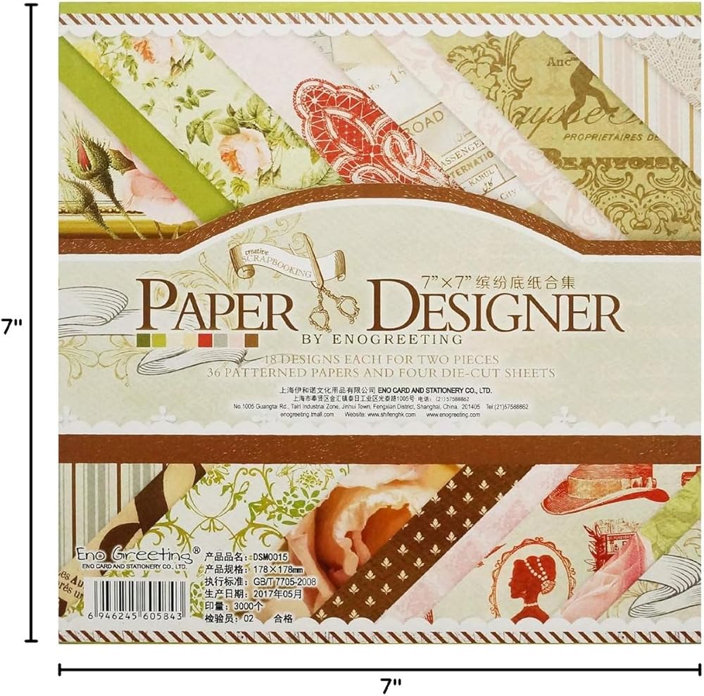 - 40 ورقة من الورق المصمم بـ 18 تصميمًا مختلفًا، 2 من كل تصميم و4 أوراق مقطوعة بالقالب للملصقات الحرفية المنقوشة.