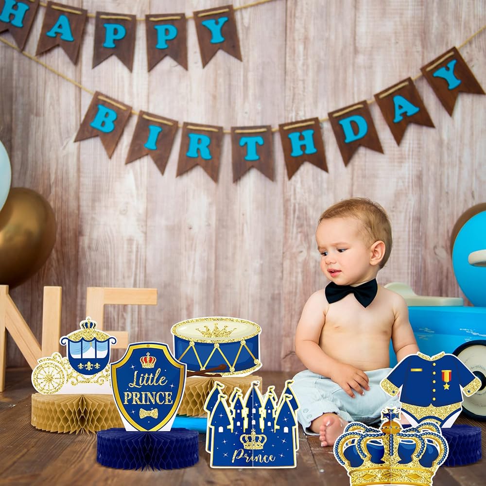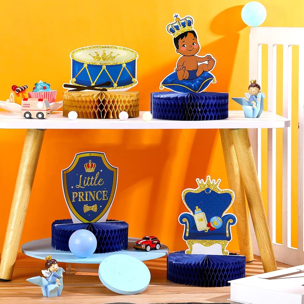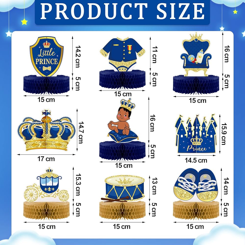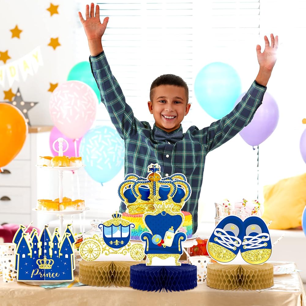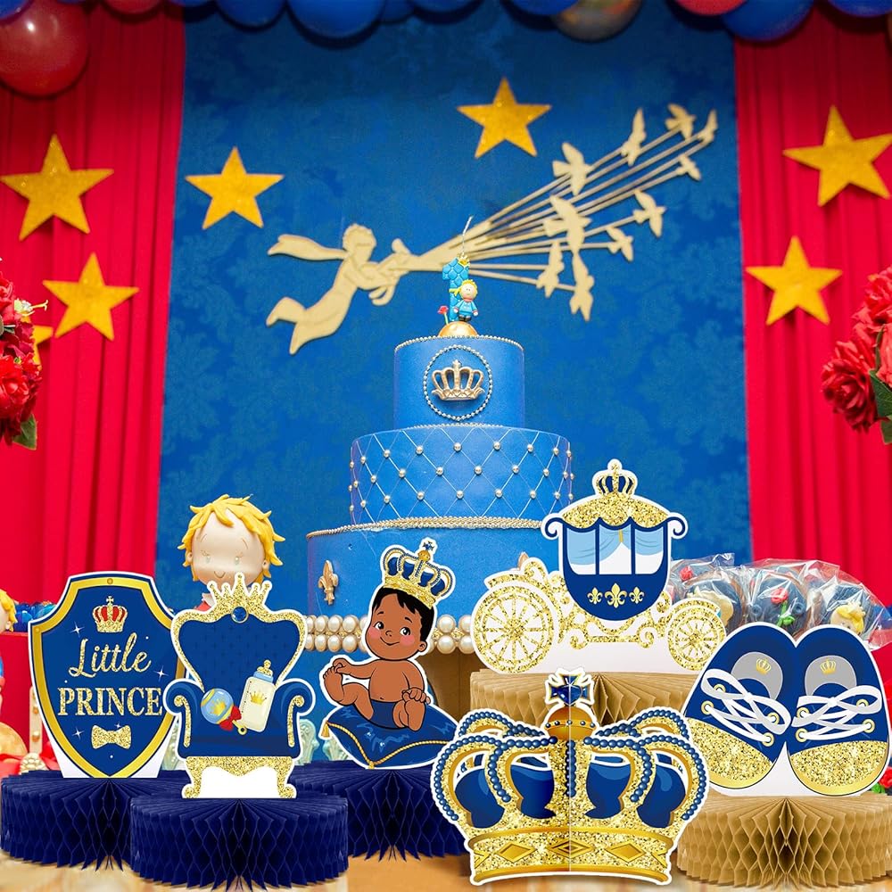 9 قطع من أغطية الطاولة المركزية على شكل خلية العسل الأمير الملكي للأطفال الأولاد ديكور الطاولة الأمريكية الأفريقية الأزرق والذهبي قلعة تاج طاولة مركزية لمستلزمات تزيين عيد ميلاد المولود
