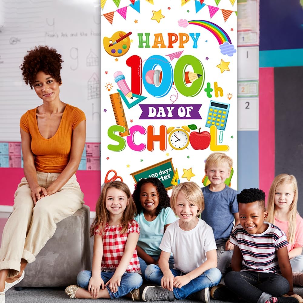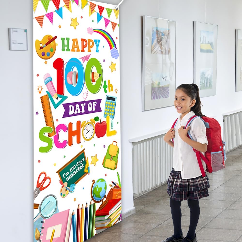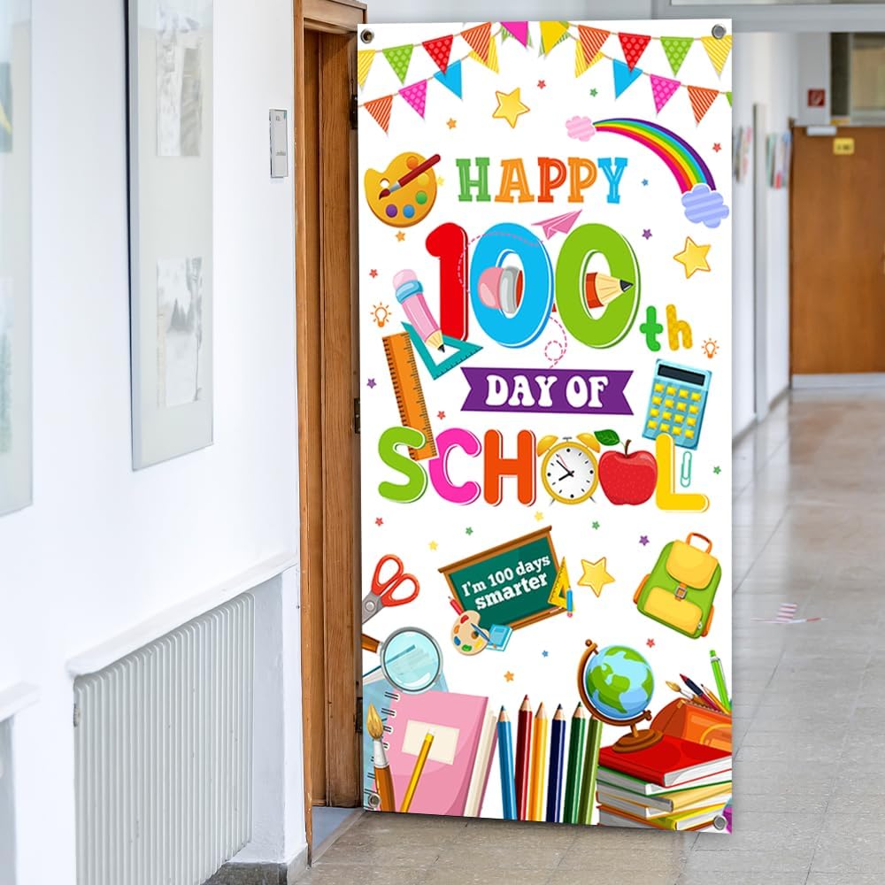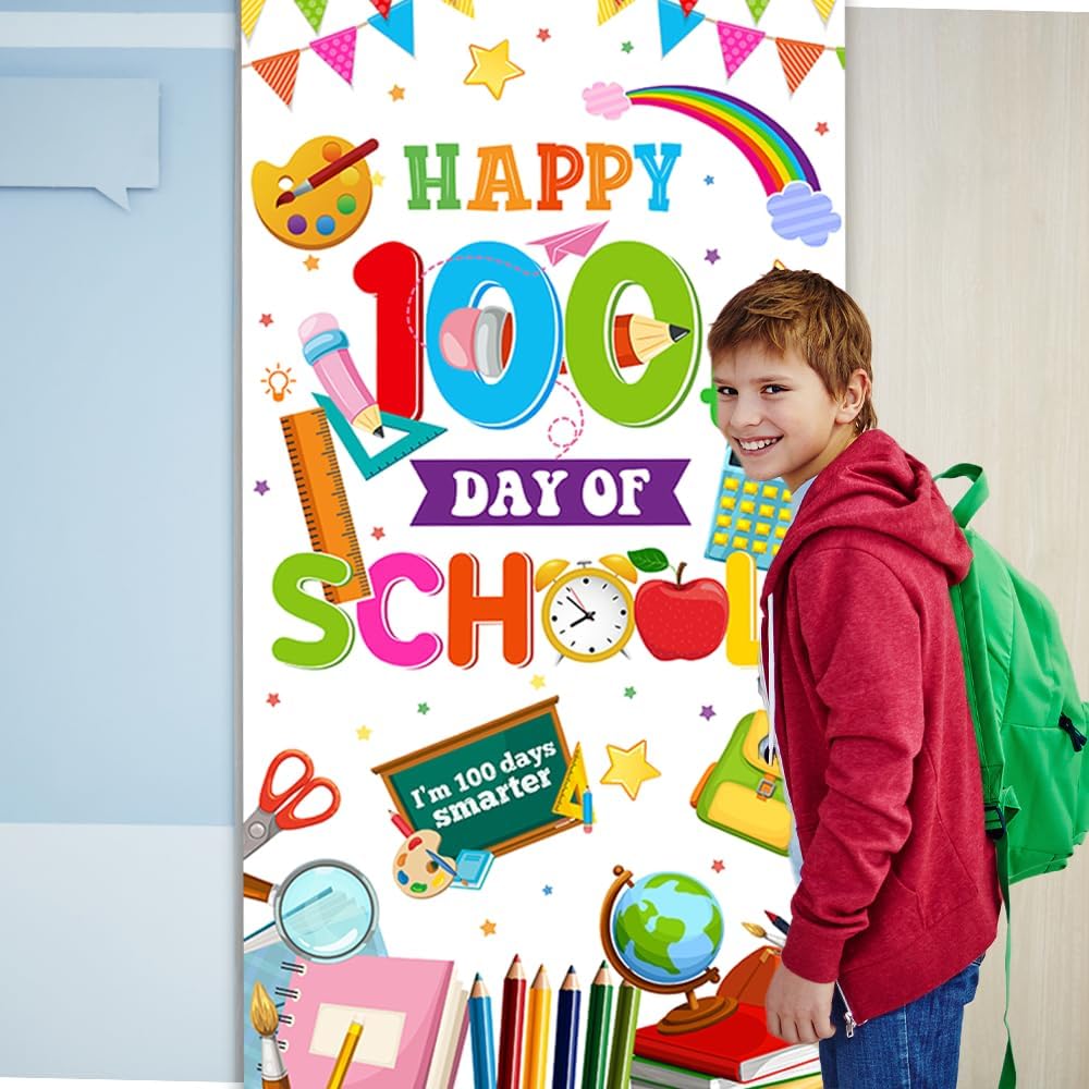 لافتة باب المدرسة ليوم 100 السعيد، غطاء باب المدرسة للأطفال، طلاب رياض الأطفال، مرحلة ما قبل المدرسة الابتدائية، لوازم تزيين حفلات اليوم الـ 100 (أبيض)