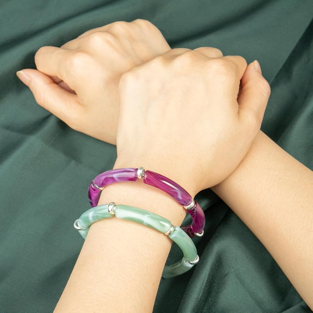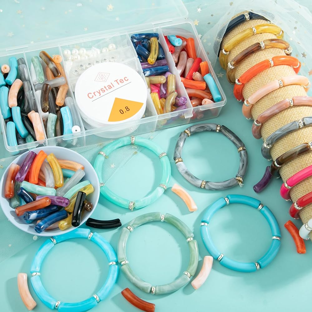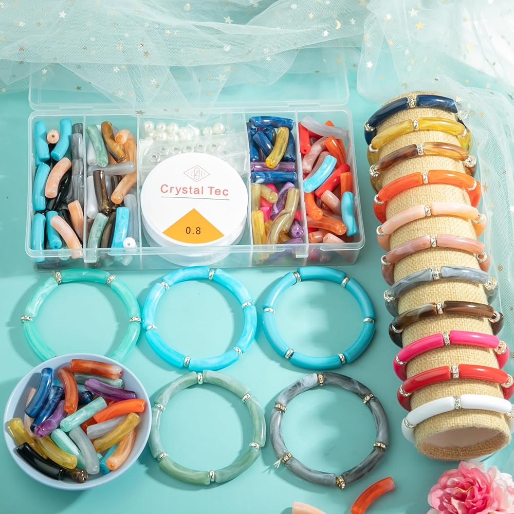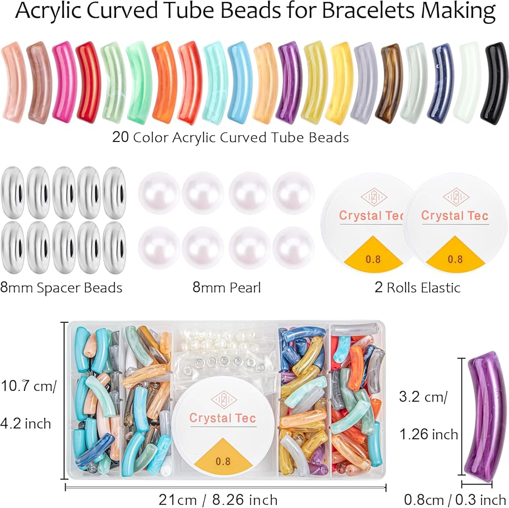 • 【Curved Tube Beads For Jewelry Making】Acrylic Bamboo Beads Kit Including 120Pcs Acrylic Curved beads, 60pcs 8mm Spacer Beads, 60pcs 8mm Pearl Beads, 2 Rolls Elastic Strings. The Colorful Acrylic Tube Beads Bracelet, Simple-Fashion-Elegant, Showing off the feminine charm, Can Be Used On Various Occasions. You Can Choose Them As A DIY Gift For Your Friends And Yourself.