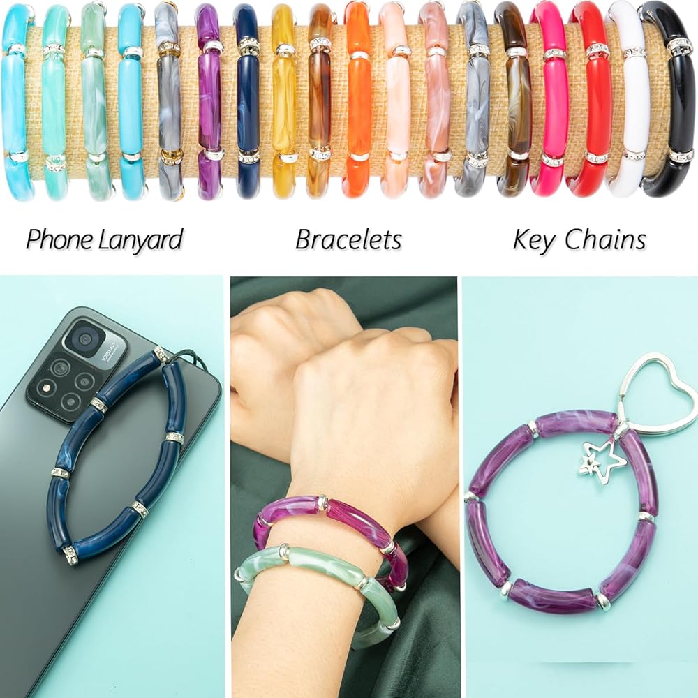 120 قطعة من الخرز الأنبوبي المنحني لصنع الأساور، 20 لونًا من الخرز الأنبوبي من الخيزران الأكريليك وخيوط مرنة لقلادة يدوية وسوار للهاتف