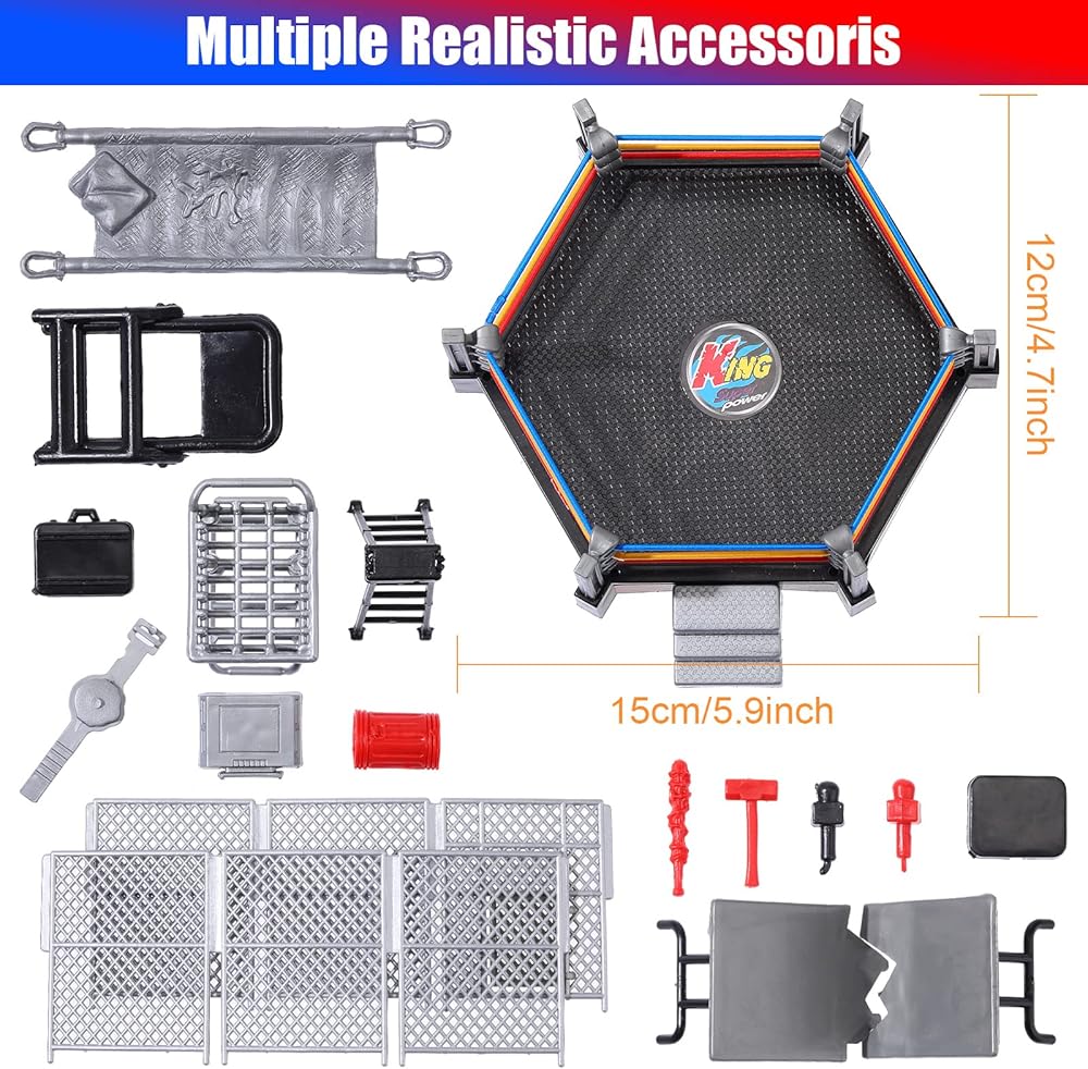 دعائم تفاصيل غنية وواقعية: ألعاب مجسمات شخصيات المصارعين واقعية في المظهر، كل مصارع لديه خطوط واضحة من العضلات، ويرتدي الملابس الداخلية والسراويل وأكثر من ذلك، تبدو حية وقوية، وتحتوي على قتال في القفص، مكتب، حواجز، نقالات، صناديق قمامة، أقفاص، سلالم، كراسي، حقائب السفر، إلخ، ستضيف إلى التجربة الشاملة