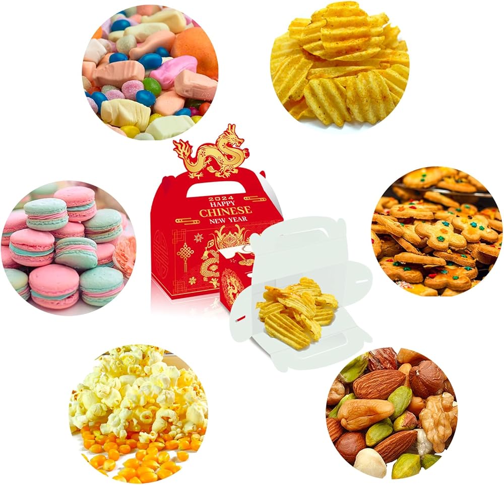استخدامات واسعة: ستعرض صناديق الحلوى الخاصة بنا بفخر الخبز اللذيذ أو الدونات أو الكب كيك أو البسكويت أو الكيك أو الحلوى أو الفطائر أو الشوكولاتة أو الكمأ أو البسكويت أو البطاطس المقلية. تساعد عناصر السنة الصينية الجديدة التمثيلية على التعبير عن بركات العطلات الصينية وخلق جو موسمي.