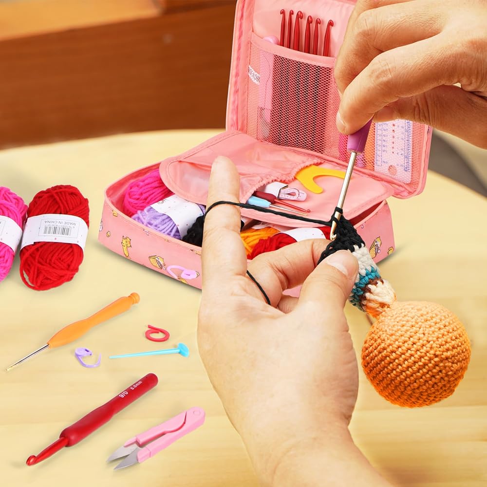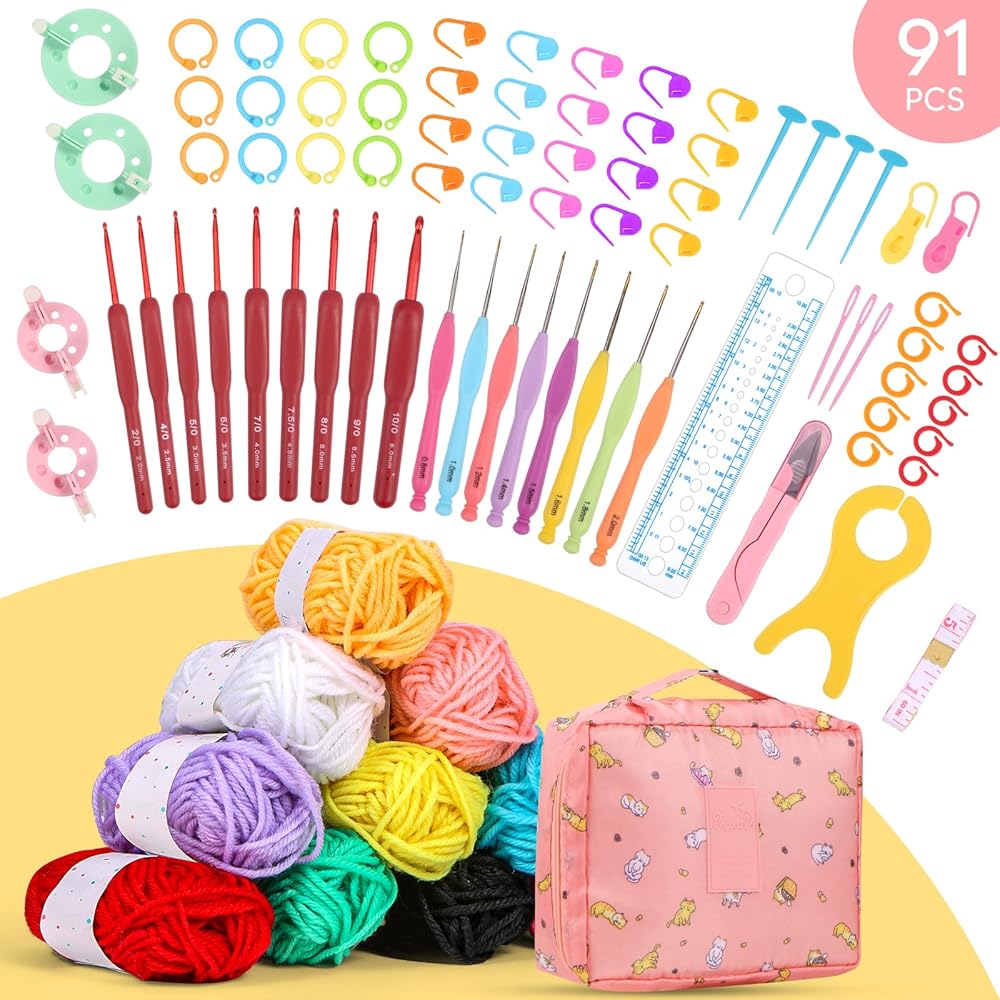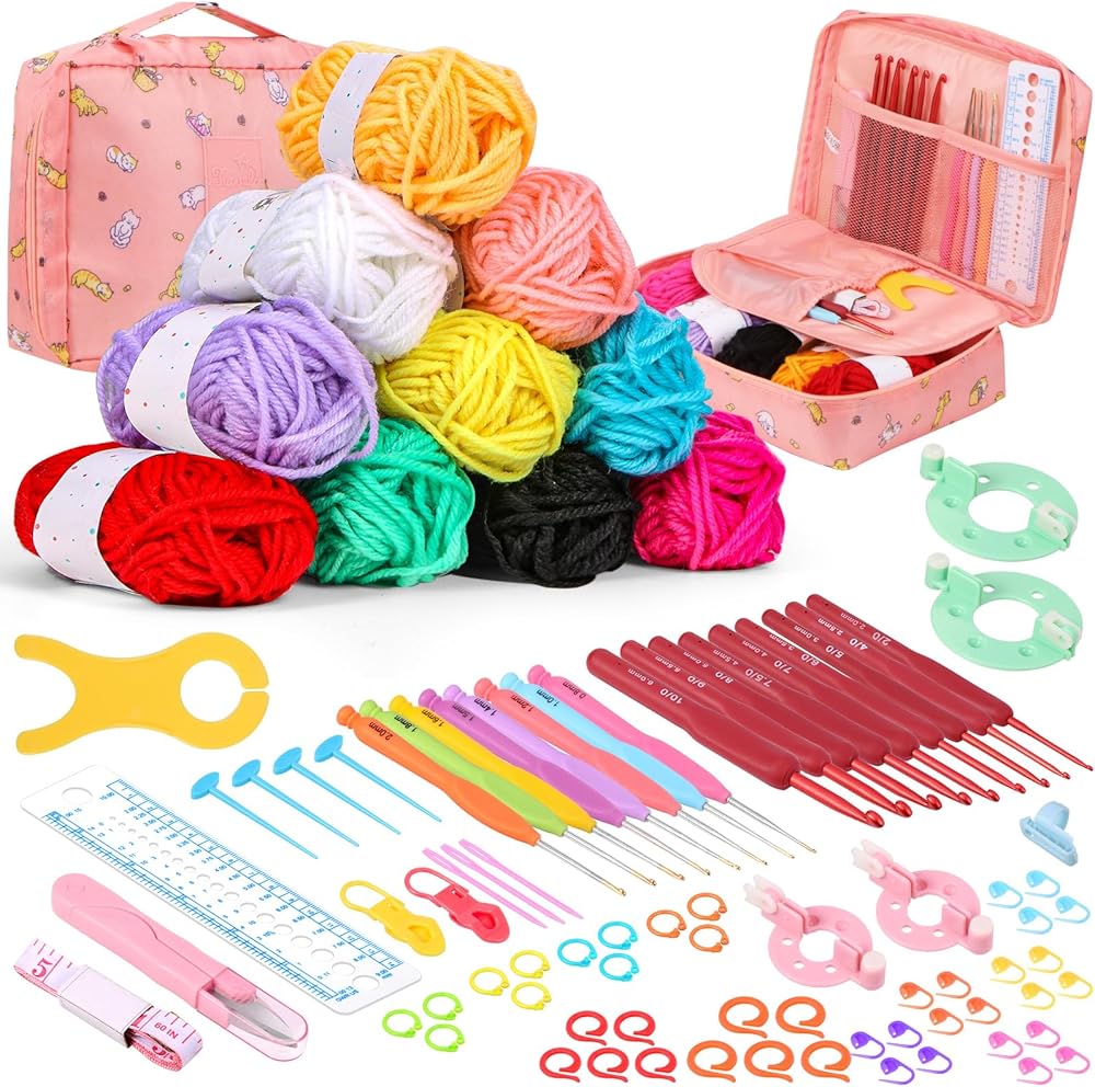Crochet Starter Kit ------ This crochet kit contains 12 different colors of yarn, 9 red soft shank crochet hooks, 8 lace fine needles, 32 stitch markers, 1 bobbin winder, 5 bead pins, 2 stitch markers, 4 pom-pom holders, 3 sewing pins, 10 counting loops, 1 yarn guide, 1 pair of small scissors, 1 ruler, 1 tape measure, 1 pink storage bag. Complete crochet kit for beginners.